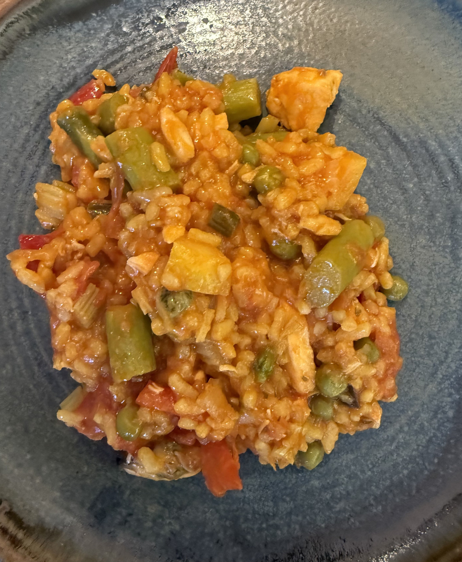 Eigentlich ist Paella nur ein Risotto, hier mit Lachs und grünem Spargel, ansonsten mit Resten, die der Kühlschrank am WE hergab.