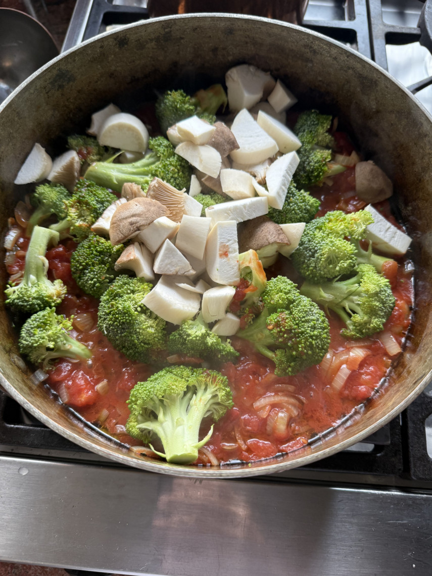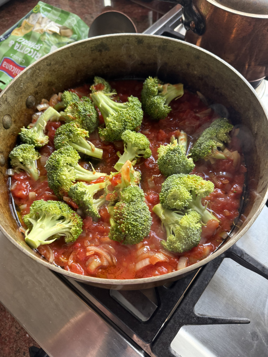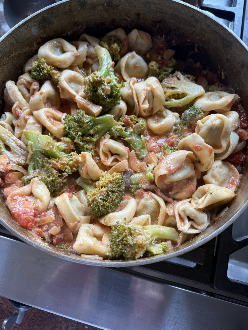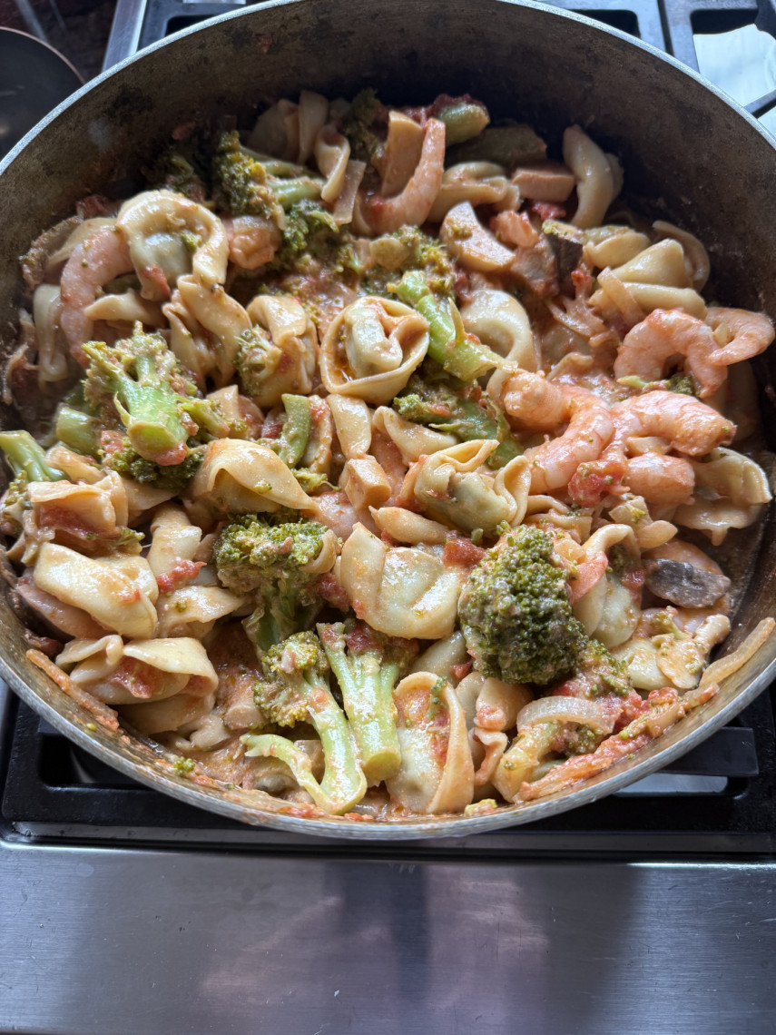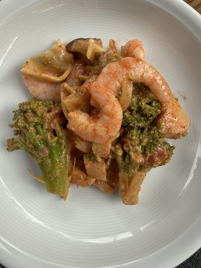 Zutaten: 500 gr. Tortellini mit Spinat-Ricotta Füllung, Olivenöl, 400 gr. San Marzano Dosentomaten, TK-Garneleneine Zwiebel, ein ganzer Brokkoli, vier Kräuterseitlinge, 200 gr. Saure Sahne, Meersalz.