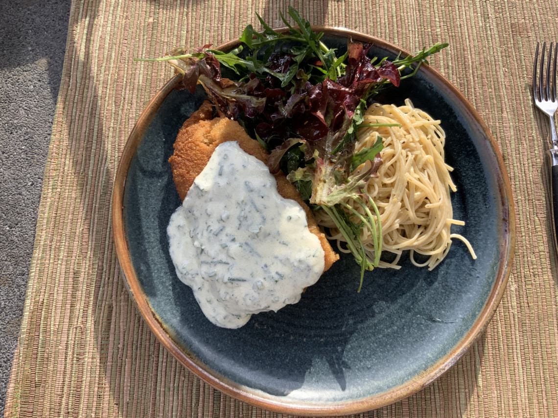 Zubereitung: Kabeljaufilets salzen, panieren und in Olivenöl von beiden Seiten dünsten. Servieren mit Spaghetti, Kräuterquark und Salat.