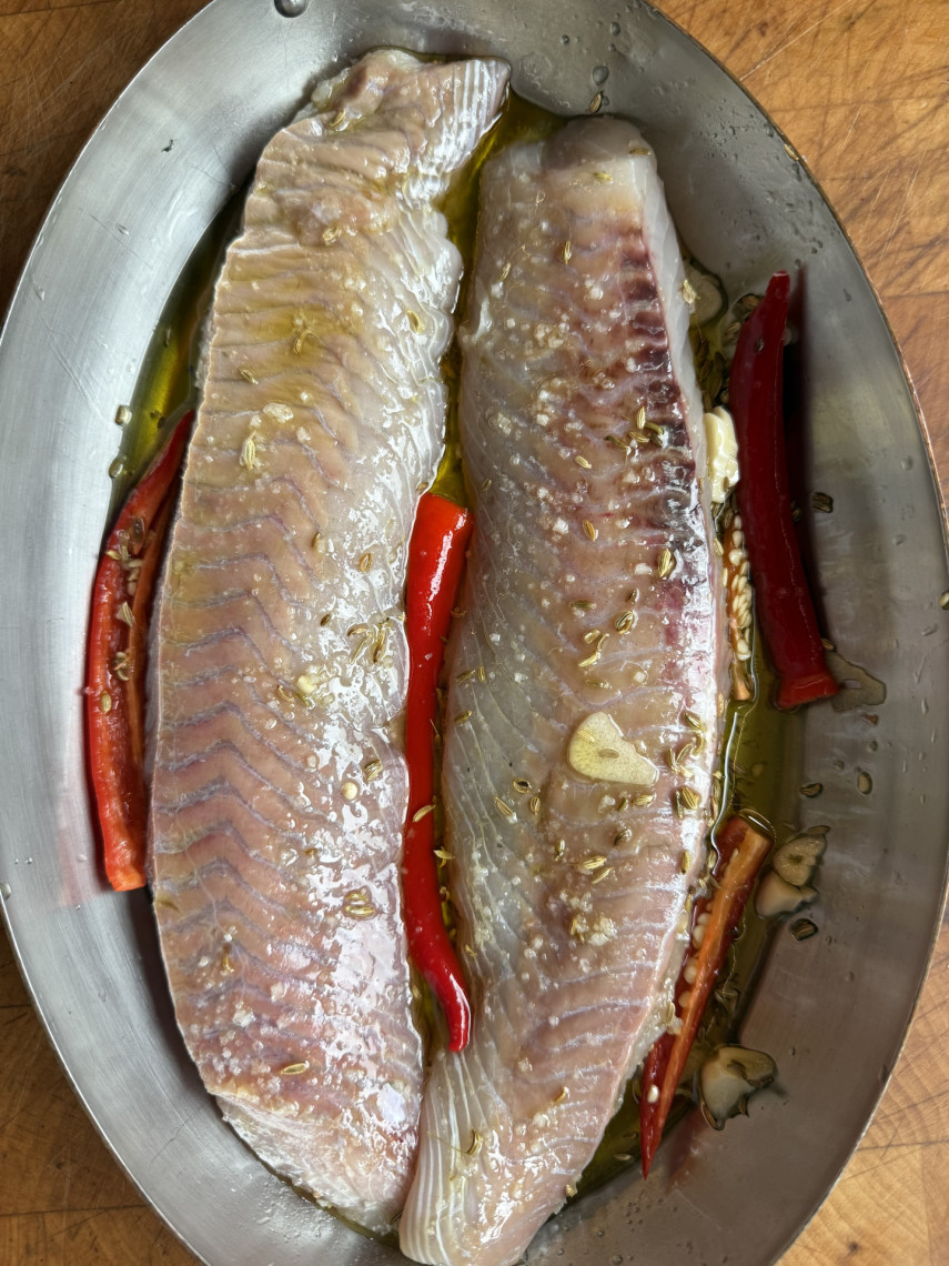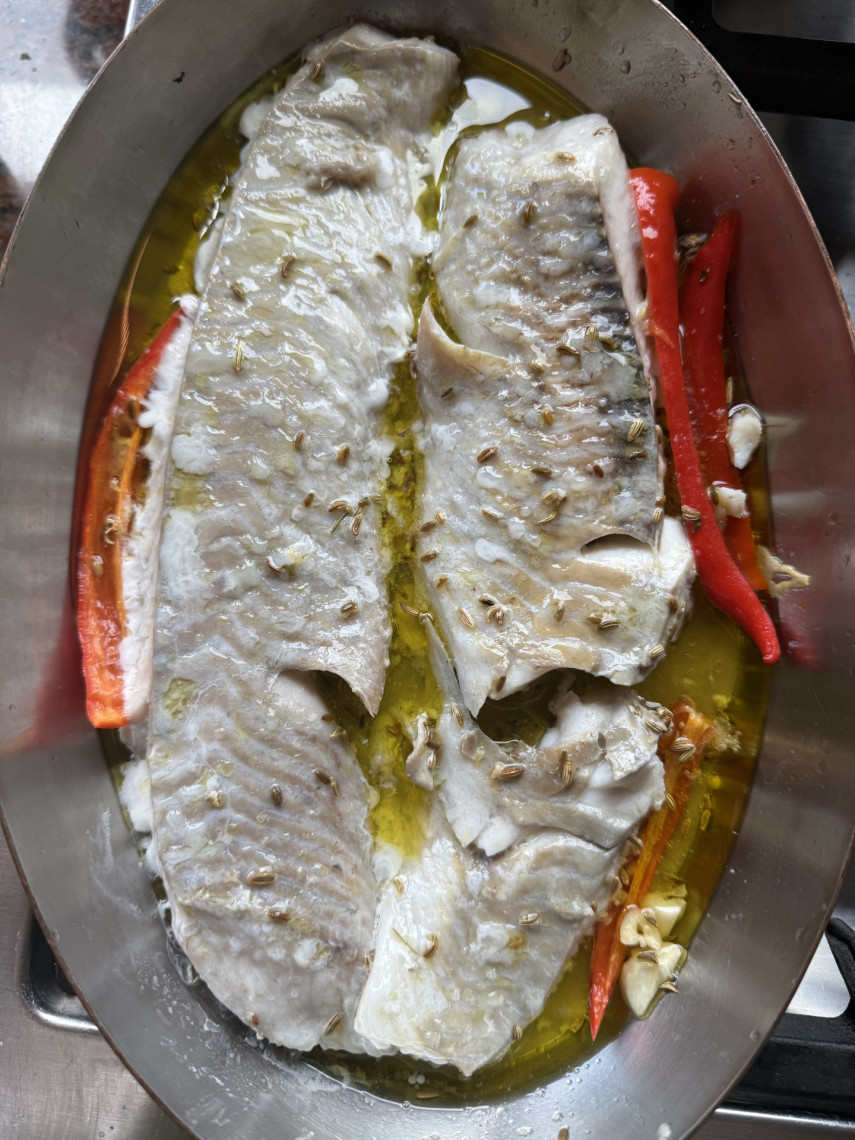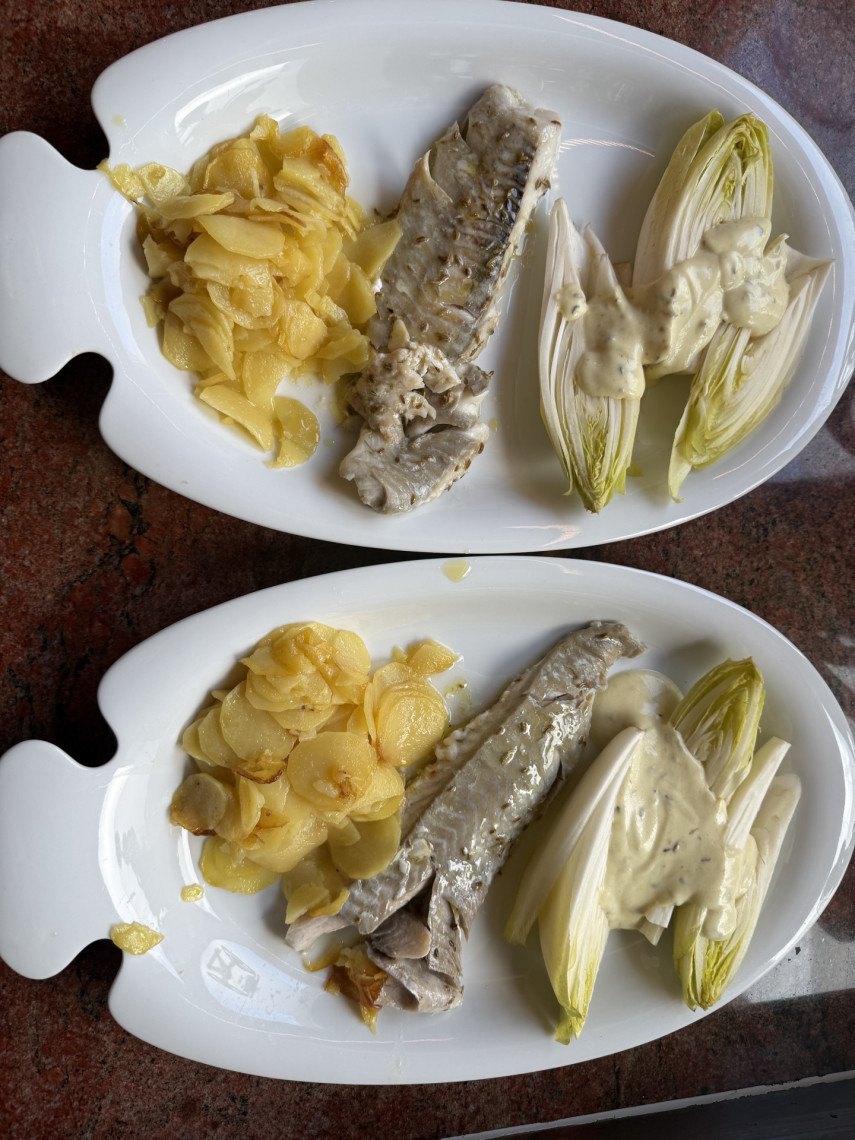 Seelachs Filet (hier 500 gr.) mit grobem Meersalz und gemörserter Fenchelsaat mit Olivenöl, und Knoblauch bei kleinster Flamme mit Deckel 15 Minuten garen. Kartoffeln mit einer Mandoline in Scheiben schneiden und in einer Schüssel mit grobem Meersalz und Olivenöl vermengen, dann in einer dickwandigen Kupferpfanne mit Deckel eine Stunde bei kleinster Flamme garen. Für das Salatdressing: Olivenöl, Joghurt, Dijonsenf, Merrsalz, gemörserte Fenchelsaat und Aceto bianco mit einem Schneebesen verrühren und über den Chicorée geben.