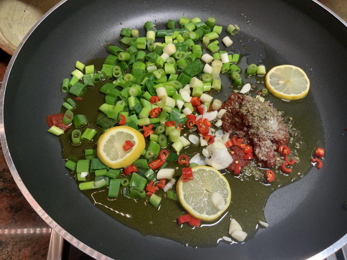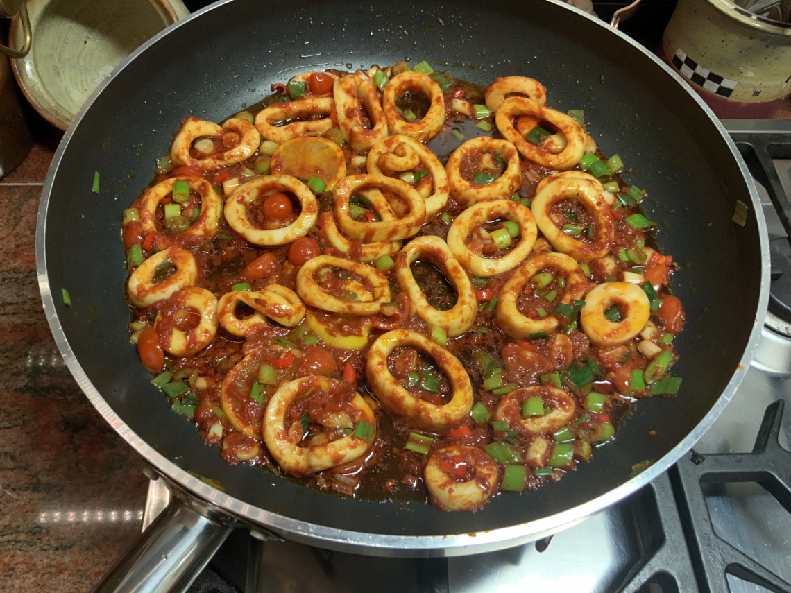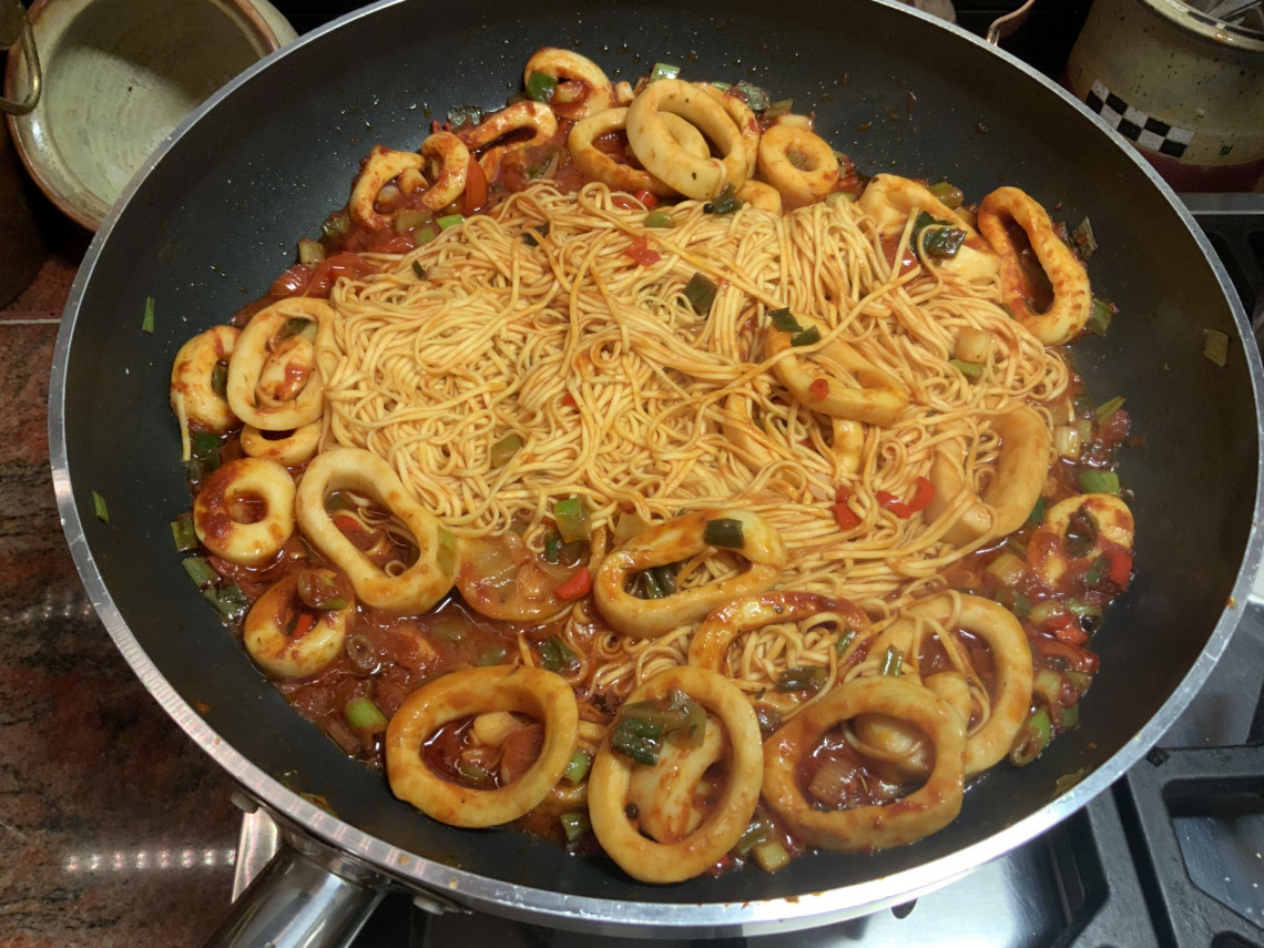 Pulpo in Wasser ohne Salz ca. 40 Minuten sanft köcheln lassen. In einer großen Pfanne mit Olivenöl, 2 EL Tomatenmark, Kräuter der Provence, Meersalz, Knoblauch, Frühlingszwiebel, Peperoni und Zitronenscheiben andünsten, den Pulpo dazugeben, dann die Nudeln mit etwas Nudelwasser hinzugeben.