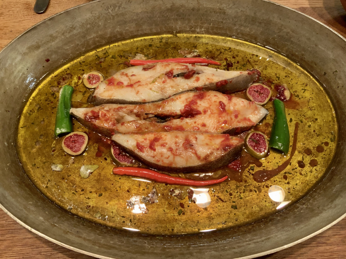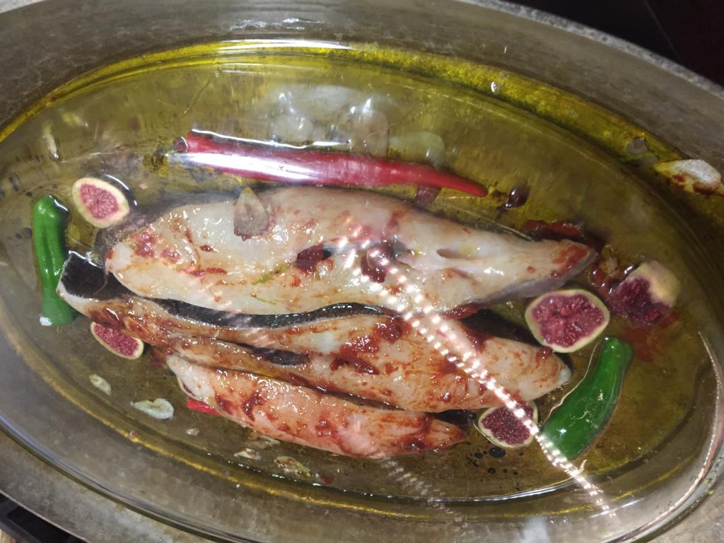 Zutaten: Steaks vom schwarzen Heilbutt, Olivenöl, Peperoni (hier rot und grün), Knoblauch, eine Feige, etwas Tomatenmark, Kräuter (Herbes Poisson), Zitronesaft und Meersalz.