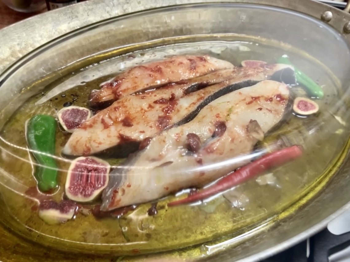 Die Pfanne langsam erhitzen. Beim Erhitzen sieht man, wie Luftblasen am Glasrand austreten, weil die in der Glasglocke erhitzte Luft sich ausdehnt. Dann den Herd abschalten. Beim Abkühlen zieht sich die Luft unter der Glasglocke wieder zusammen, es entsteht ein Unterdruck und das Olivenöl mit den Gewürzaromen wird durch den äußeren Luftdruck unter die Glocke gedrückt, bis in der Pfanne außerhalb der Glocke sich kein Öl mehr befindet. Den Vorgang noch zwei oder dreimal wiederholen, bis der Heilbutt gar ist.