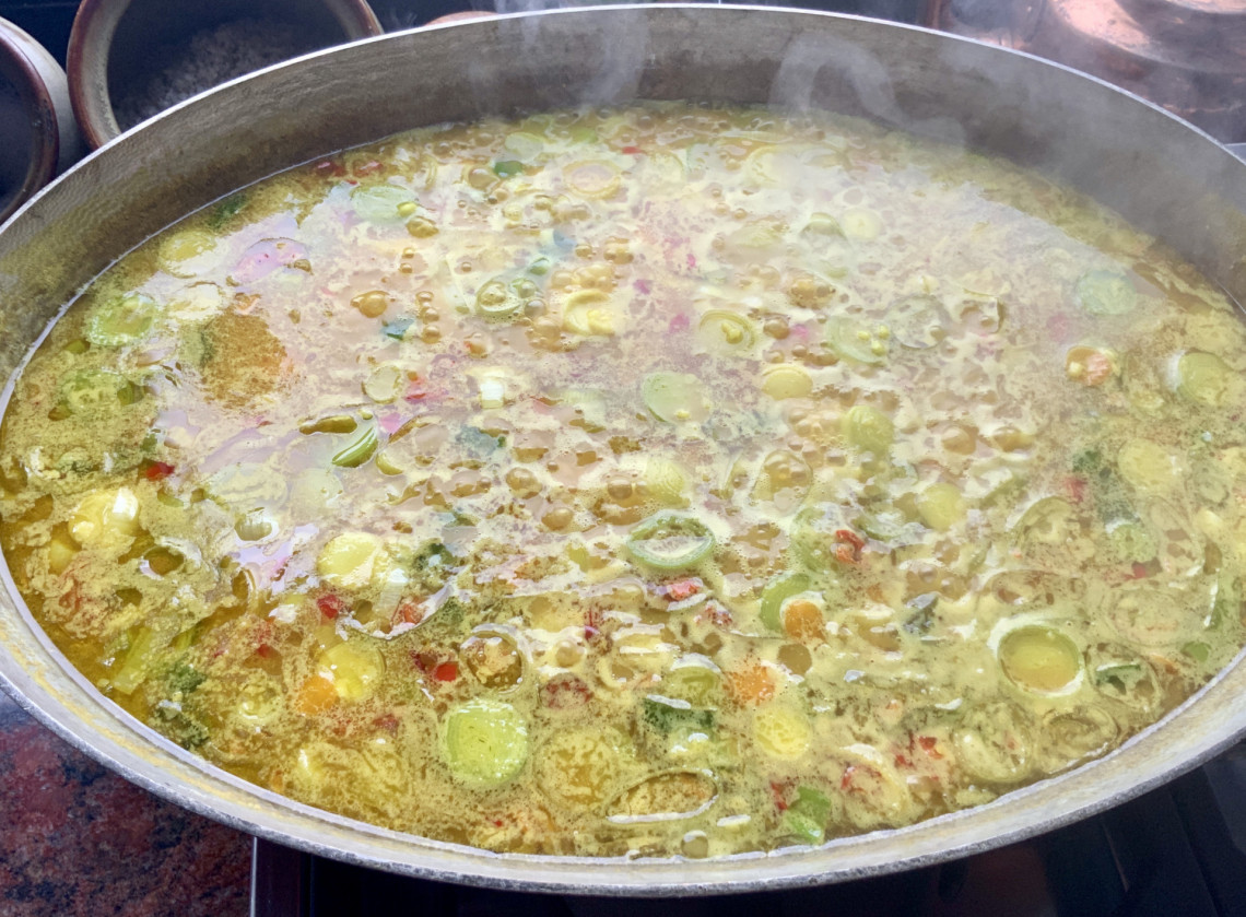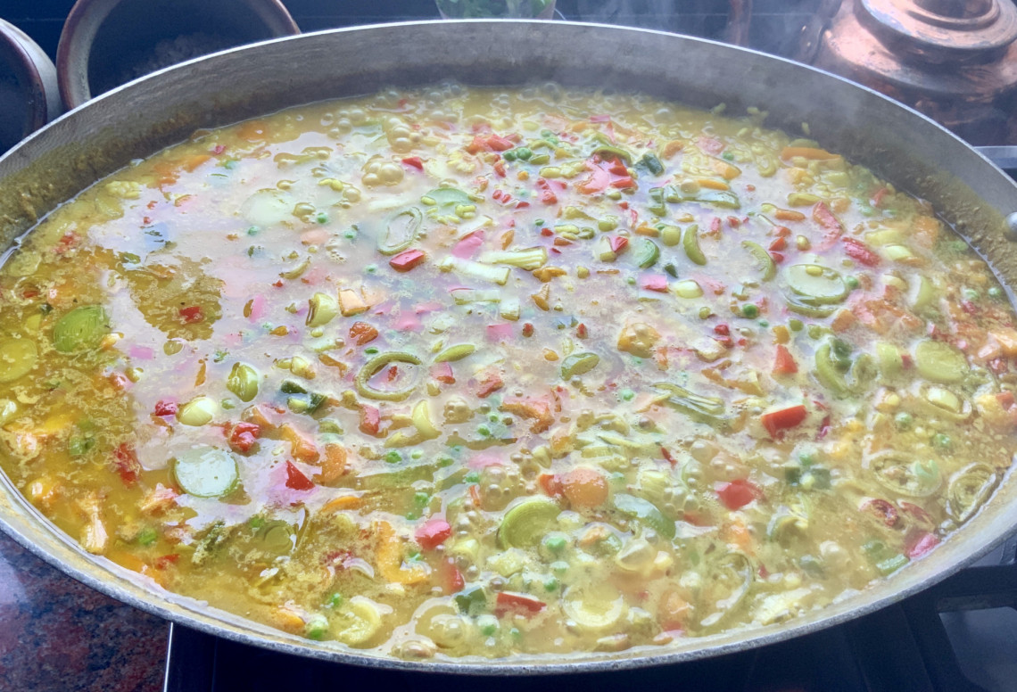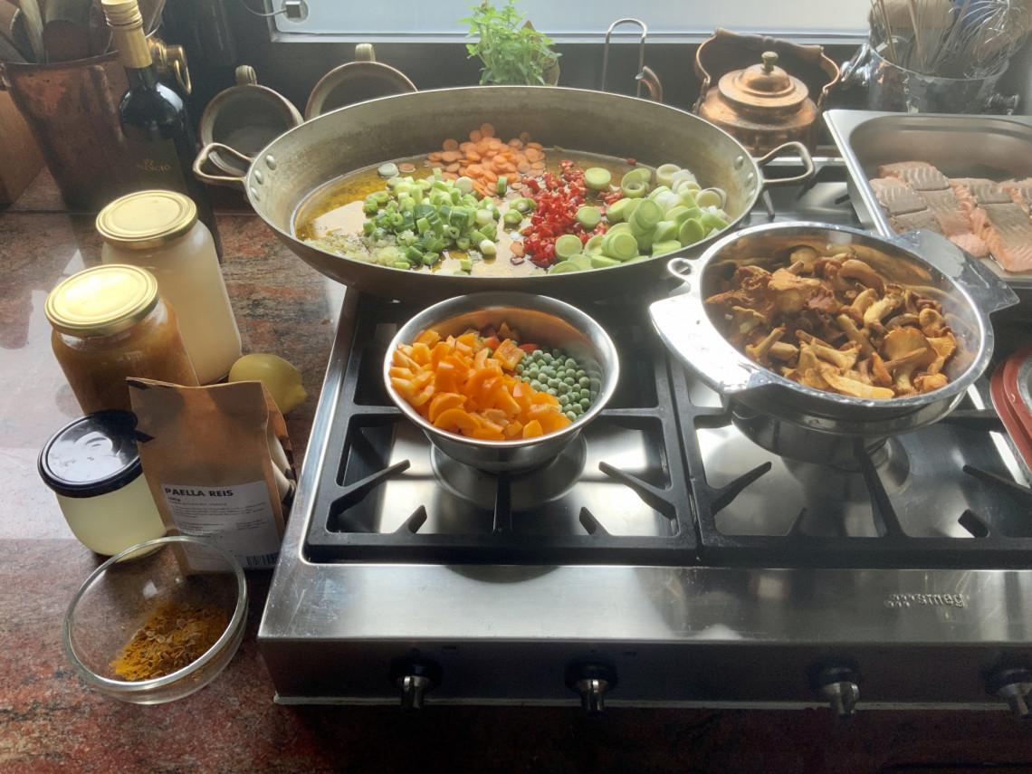 Zutaten: Paellareis, Frühlingszwiebeln, Pfifferlinge, Möhren, Lauch, Zitrone, Peperoni, gelbe Paprika, Tomaten aus dem Glas, grobes Meersalz, Erbsen, Lachs, Olivenöl, Gemüsebrühe.
