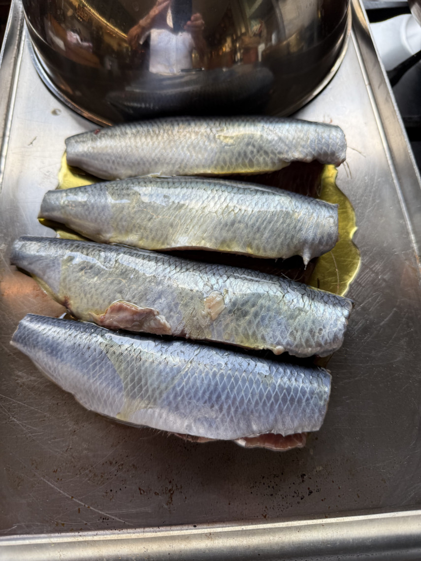 Es gibt verschiedenste Zubereitungsmethoden: Den Hering salzen oder nicht salzen, mehlen oder nicht mehlen, in Butter, Rapsöl oder Sonneblumenöl braten. Ich empfehle, den Hering einfach mit sehr wenig Olivenöl in einer Pfanne oder auf dem Teppanyaki mit geringer Hitze und ungesalzen über 50 Minuten zu garen. Beim Servieren salzen.