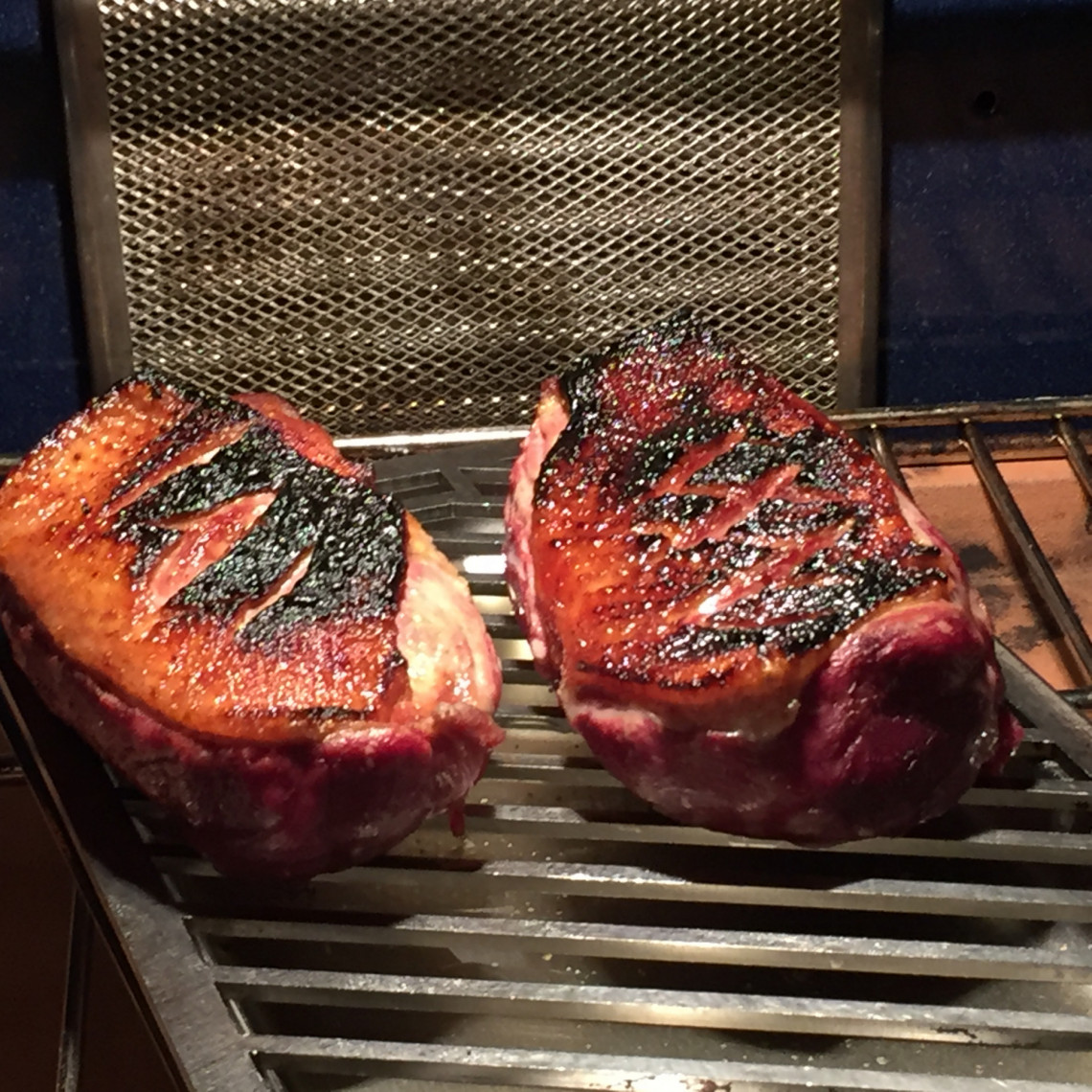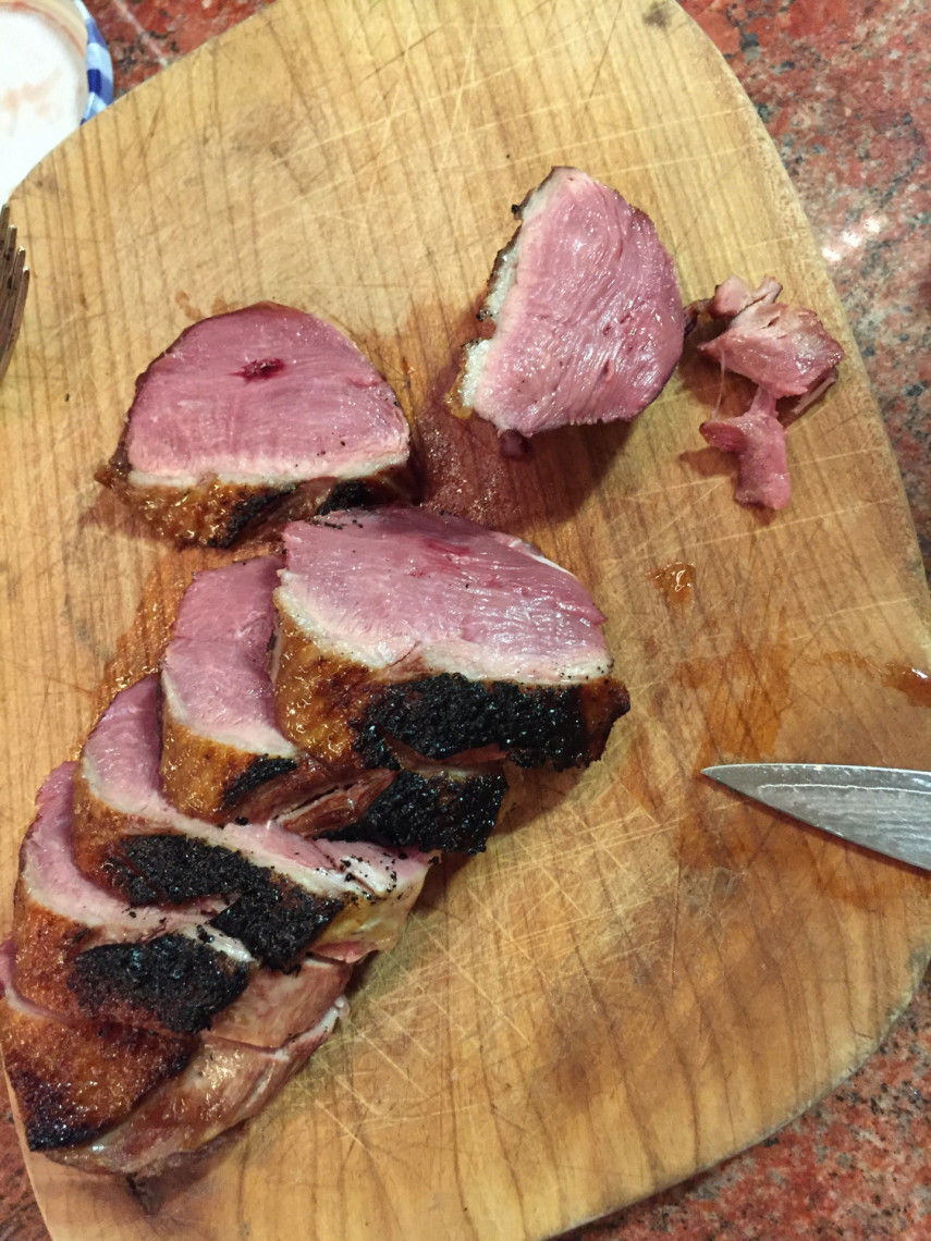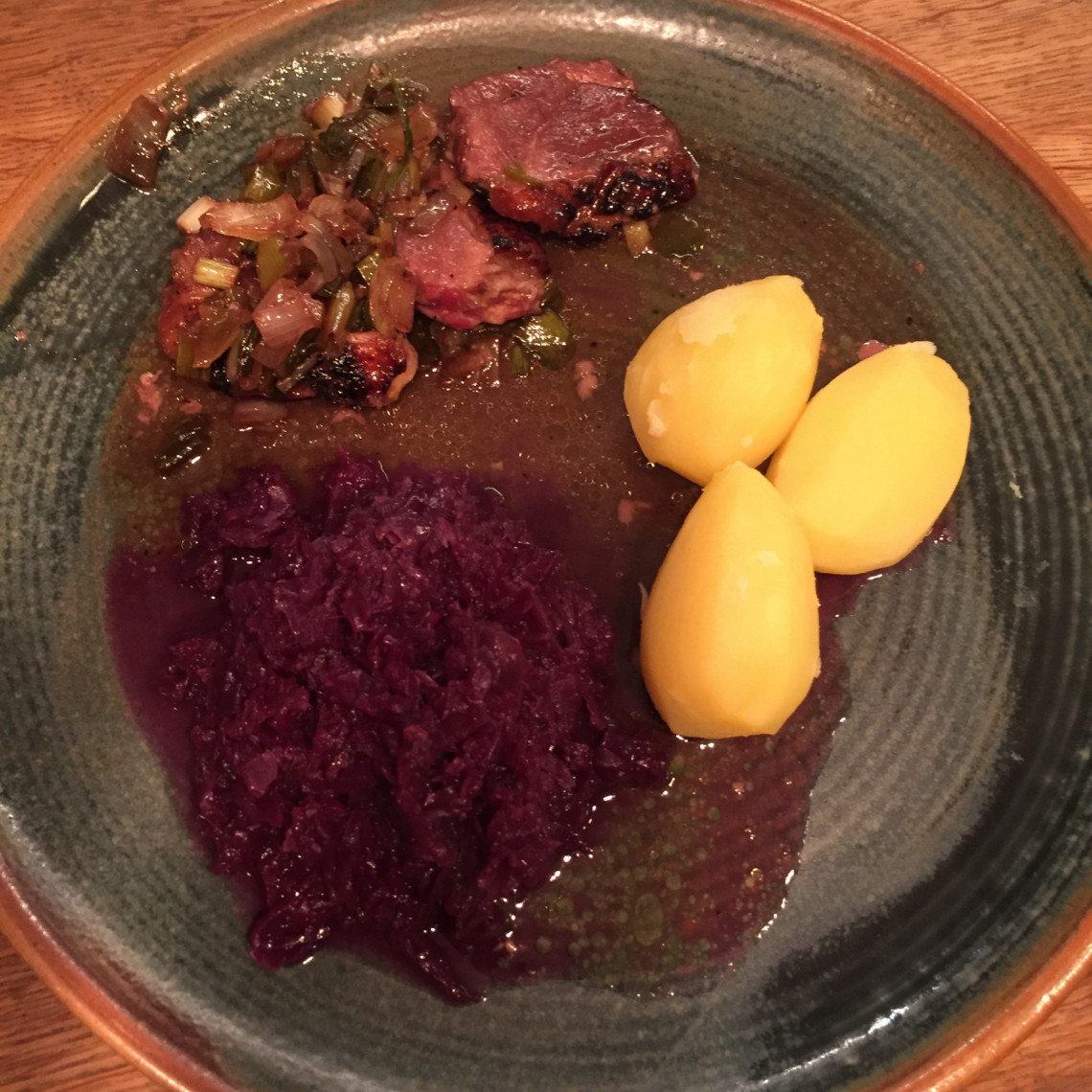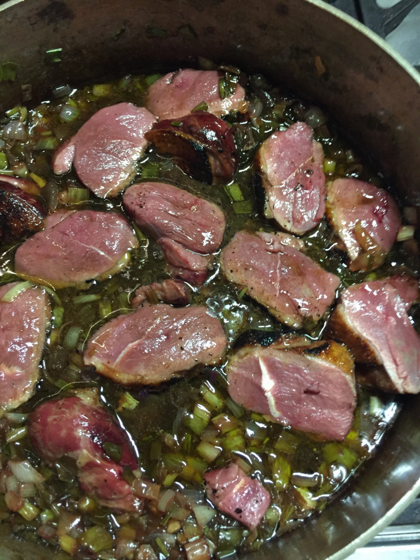 Zubereitung für 2 Personen: 2 Entenbrustfilets im Beefer anbraten und und im Backofen bei 90°C. auf 63°C. Kerntemperatur bringen. Frühlingszwiebeln in einer Pfanne in Olivenöl andünsten, mit Aceto Balsamico und Twany Portwein ablöschen, Johannisbeergelee und Granatäpfelkerne hinzu geben und langsam reduzieren lassen. Die gegarten Entenbrustfilets in die Sauce geben und mit Kartoffeln und Rotkohl servieren.