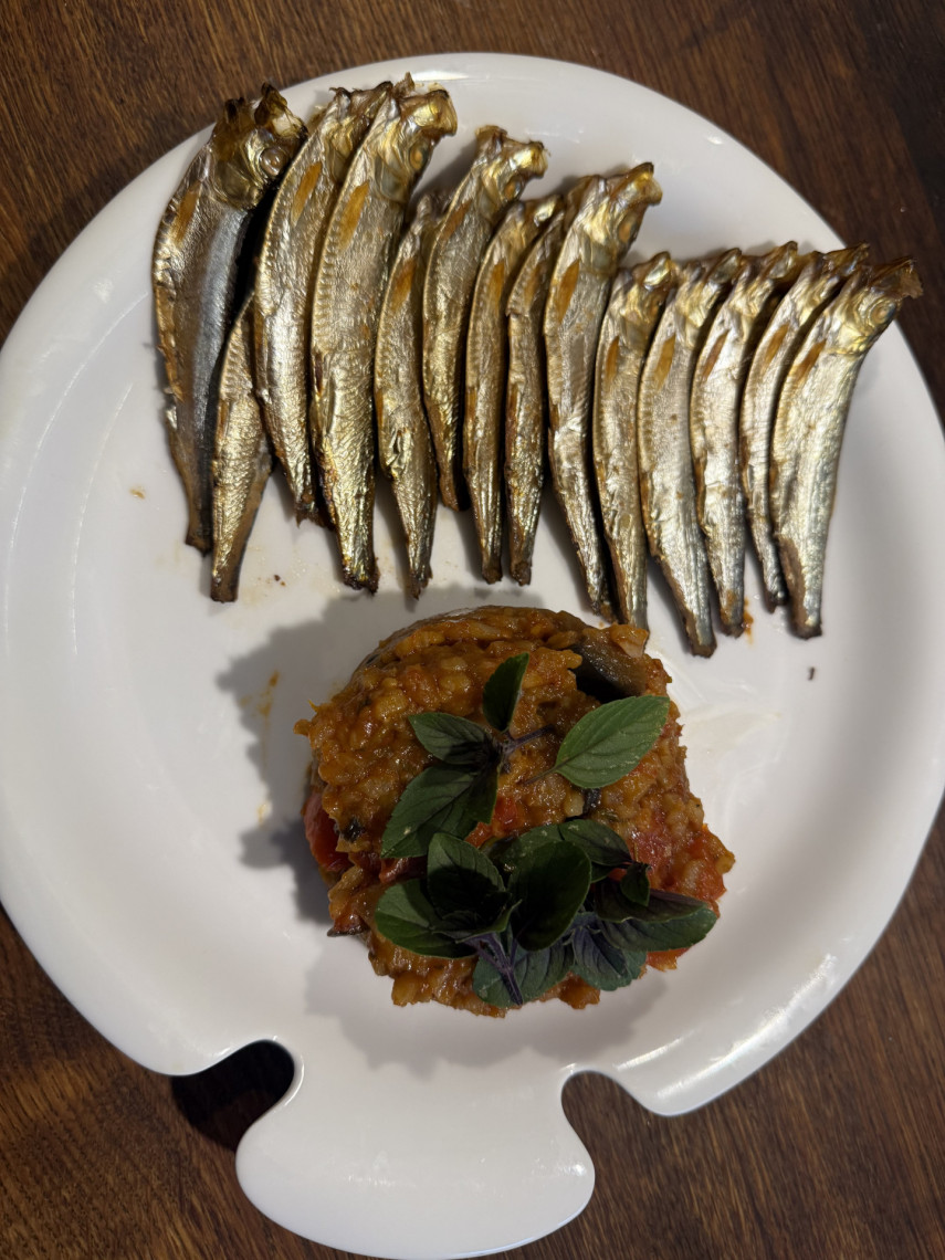 Zutaten: 130 gr. geräucherte Sprotten, Auberginen Paella, frischer African Blue Basilikum.