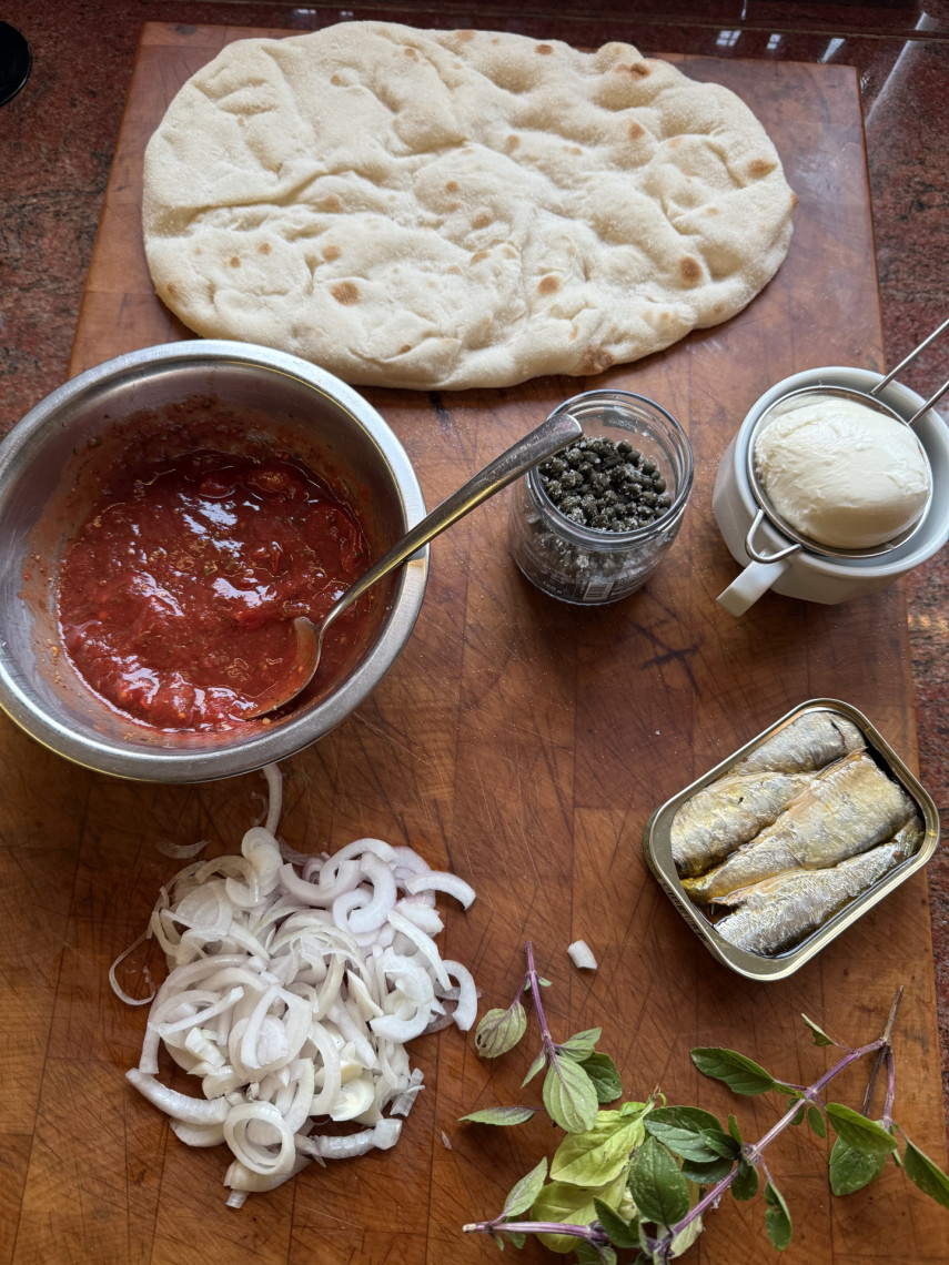 Ein Pinsa Fertigteig, 250 gr., vorgebacken, 1/2 Dose La San Marzano Tomaten, 1 TL Tomatenmark, eine kleine Zwiebel, Meersalz, Pizzakräuter, Kapern, (ein Büffelmozarella, )frischer African Blue Basilikum, Olivenöl, eine Konserve Sardinen in Olivenöl von La Quiberonnaise.
