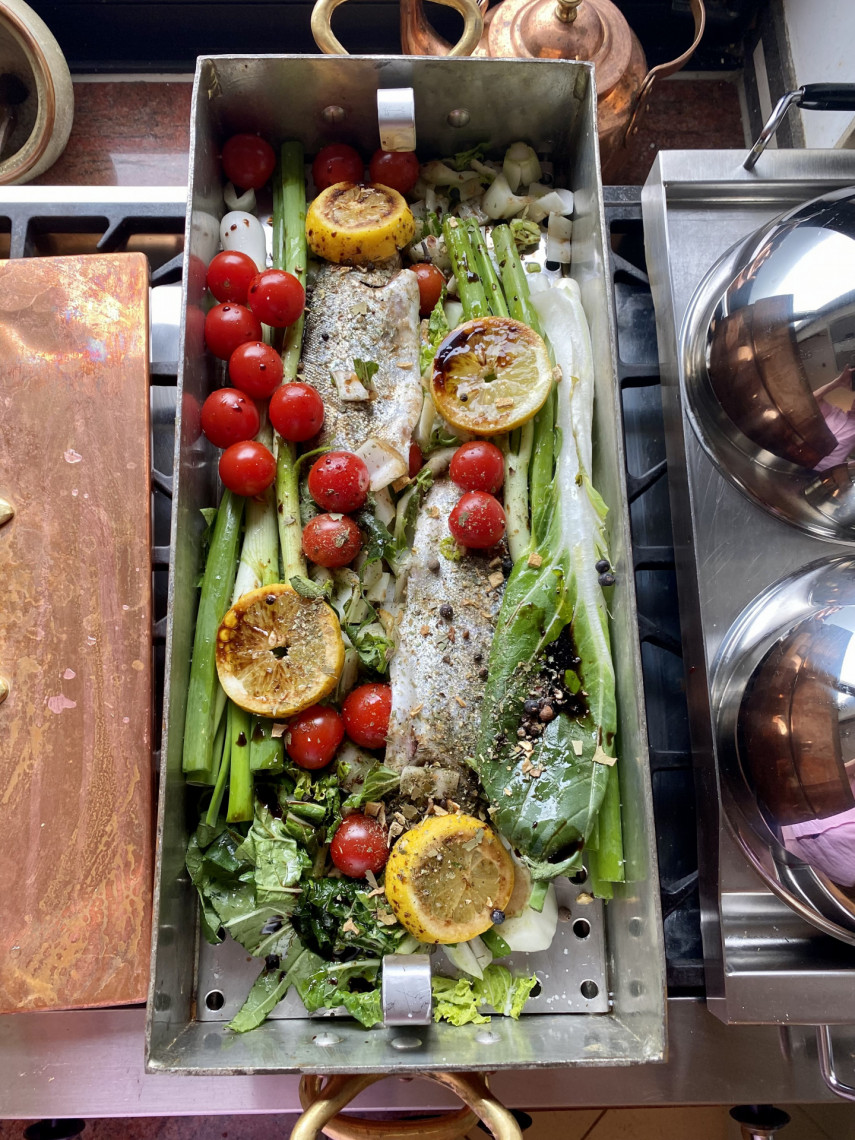Zubereitung: Forellen salzen, zusammen mit Gemüse in einem Fischdämpfer garen. Auf einem großen Teller servieren. Einfacher geht nicht.