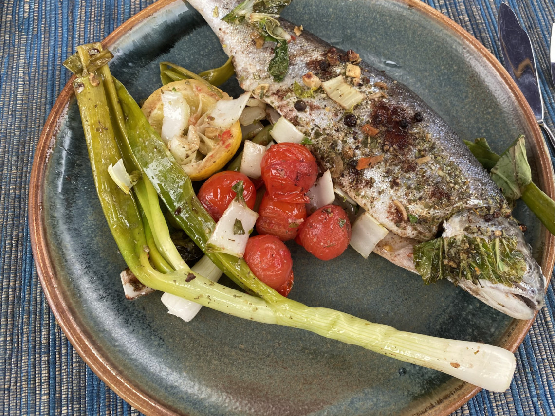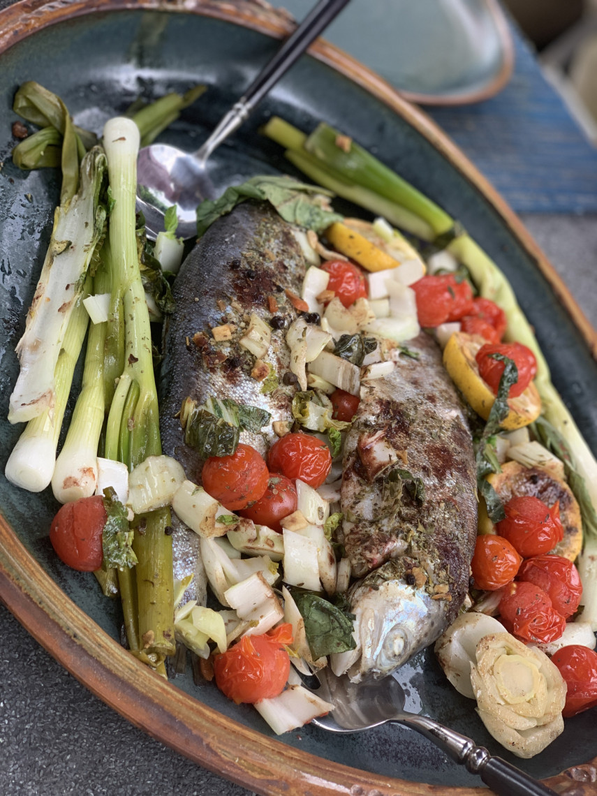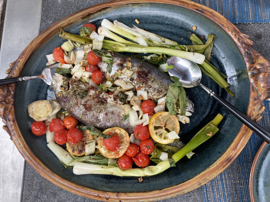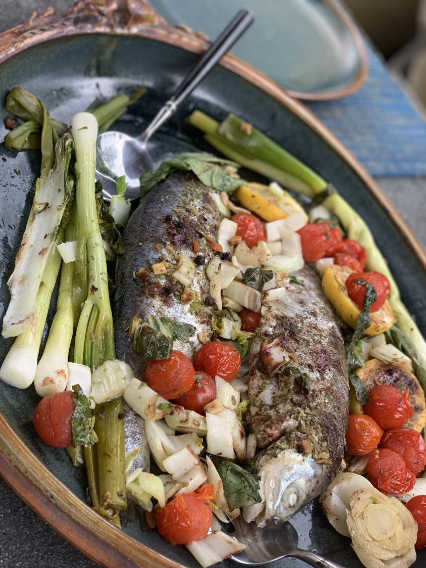 Zutaten für 2 Personen: 2 frische Forellen, Gemüse, Tomaten, Zitrone.