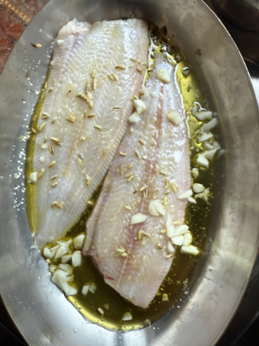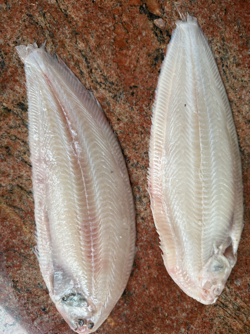 Zwei kleine Seezungen (Nordsee, Schleppnetz), 270 gr., für 2 Personen. Kopf mit einem Küchenmesser bis knapp über die Wirbelsäule hinweg von der Fleischseite einschneiden. Dann den Kopf mit den Innereien vom Körper abziehen. Flossensaum mit einer Schere vom Schwanz zum Kopf hin abschneiden. Fisch mit Olivenöl, Meersalz, Fenchelsamen und zwei Knoblauchzehen in einer kleinen Pfanne mit Deckel garen.
