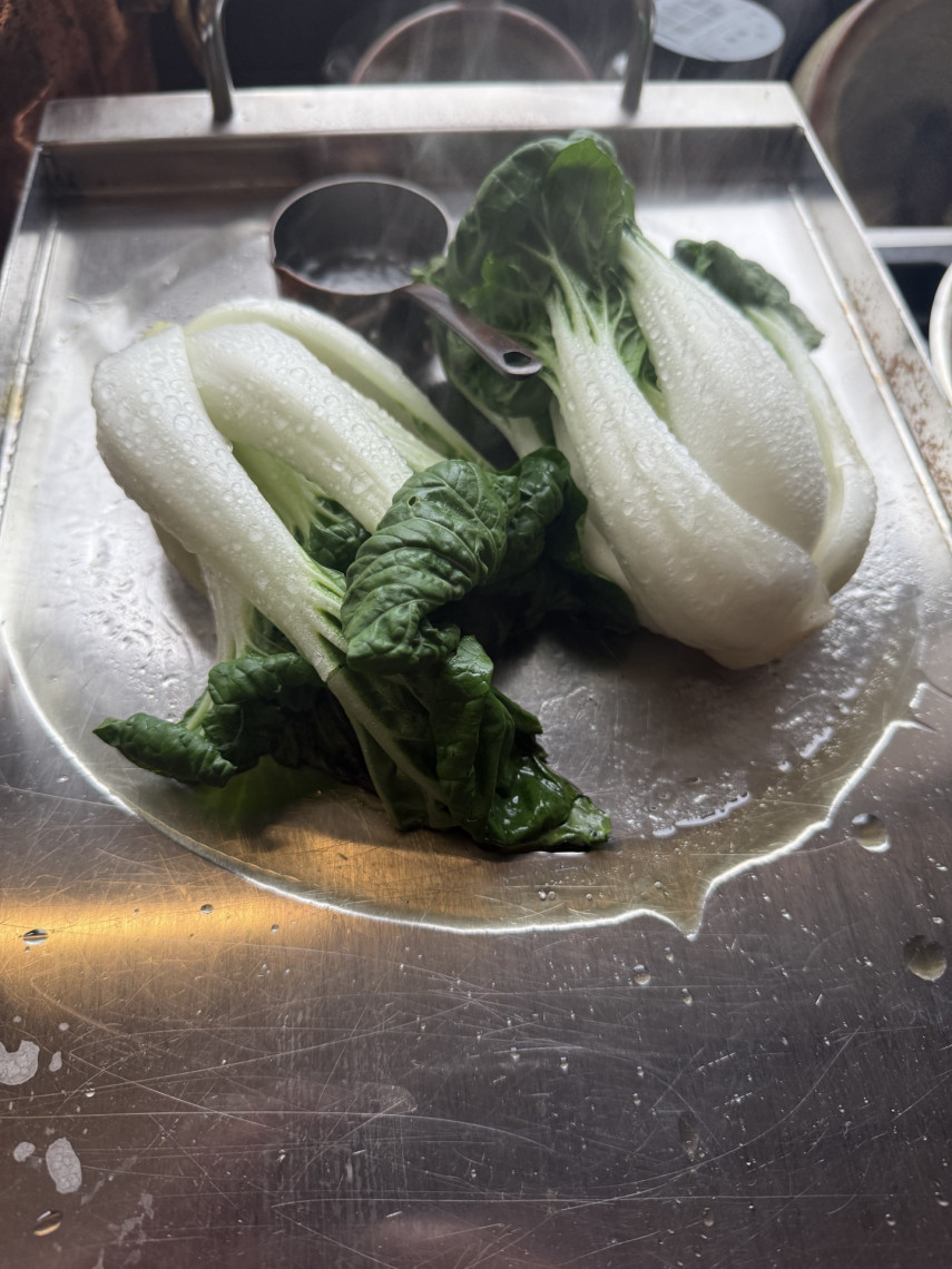 Pak Choi auf dem Teppanyaki mit einem kleinen Wasserspender mit Dunstglocke 25 Minuten garen. Kartoffeln in Scheiben schneiden und mit Olivenöl und Meersalz in einem Kopfertopf mit Deckel bei kleinster Hitze 50 Minuten garen. Pak Choi beim Servieren salzen und mit Aceto balsamico betreufeln.