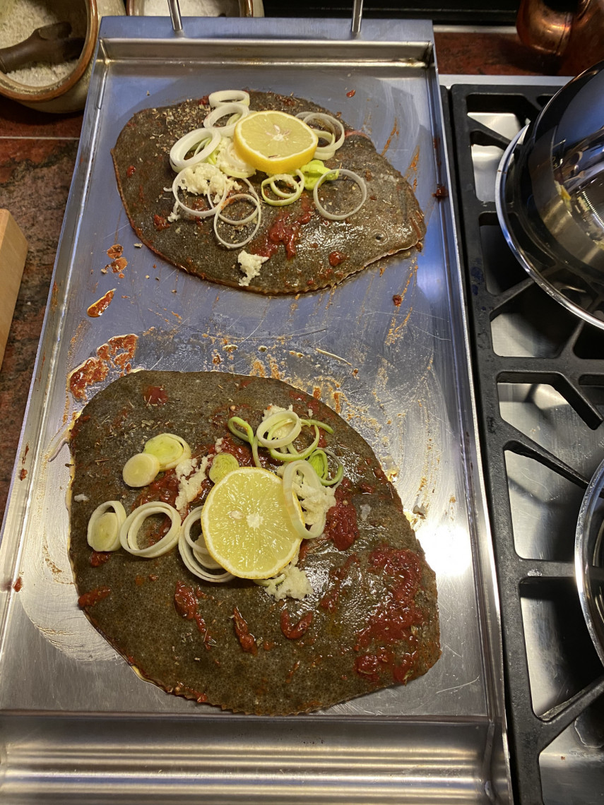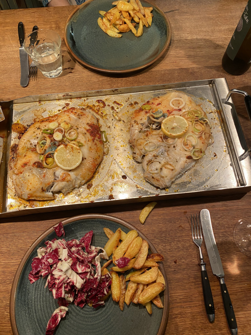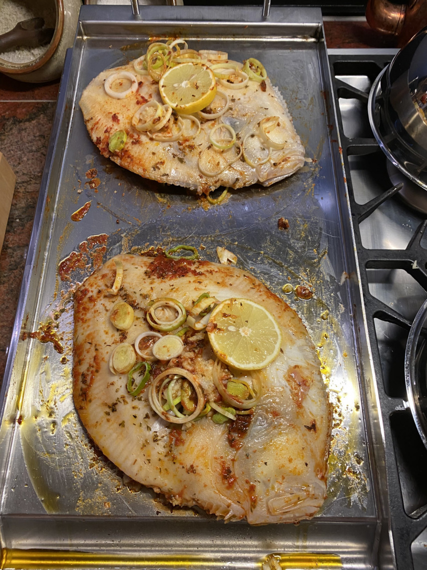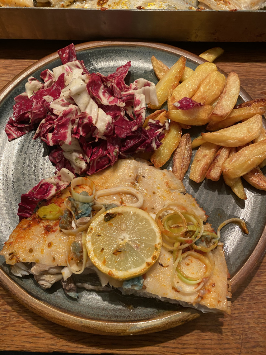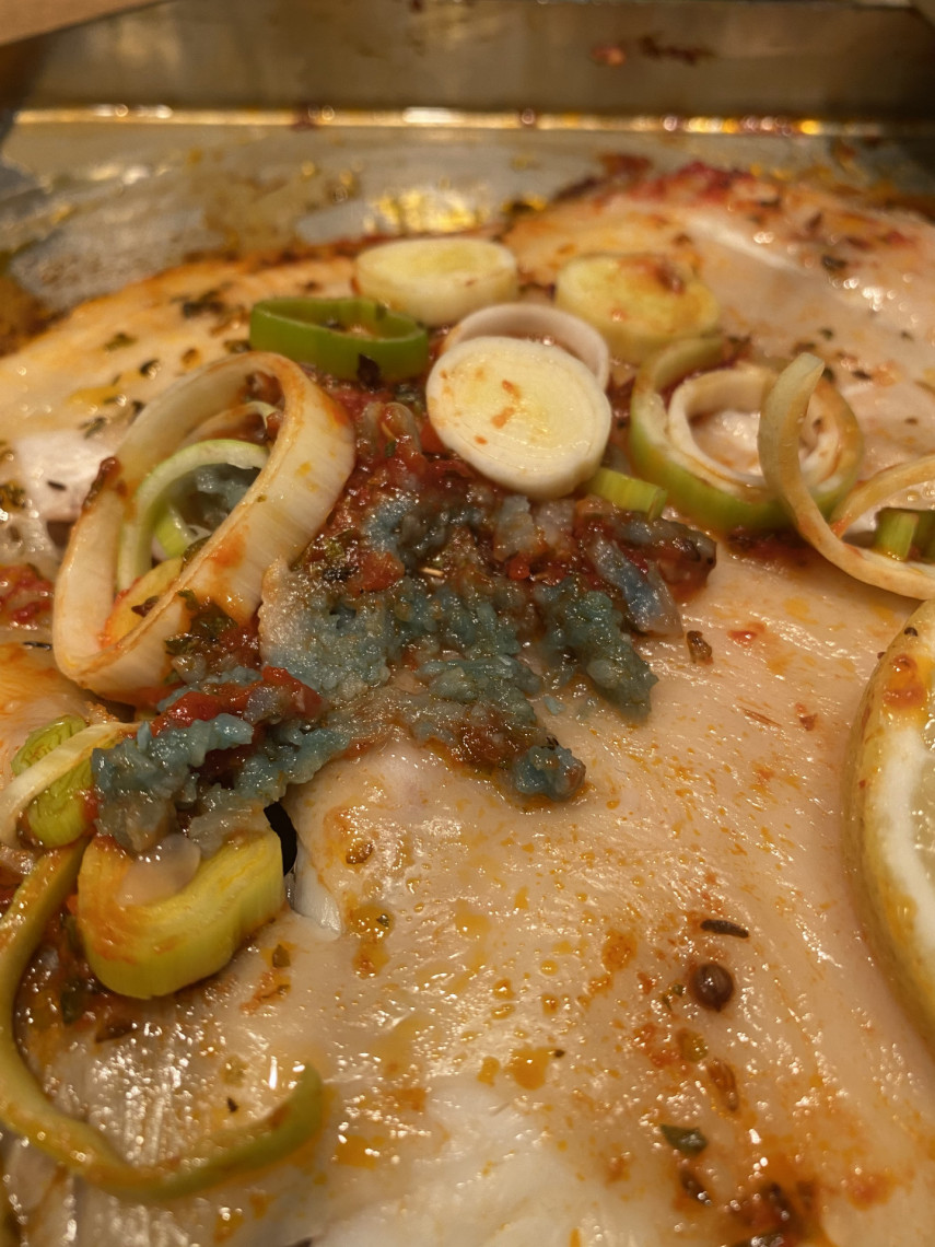 Zutaten: Zwei Baby Steinbutts, Lauch, Knoblauch, Zitrone, Tomatenmark, Meersalz.