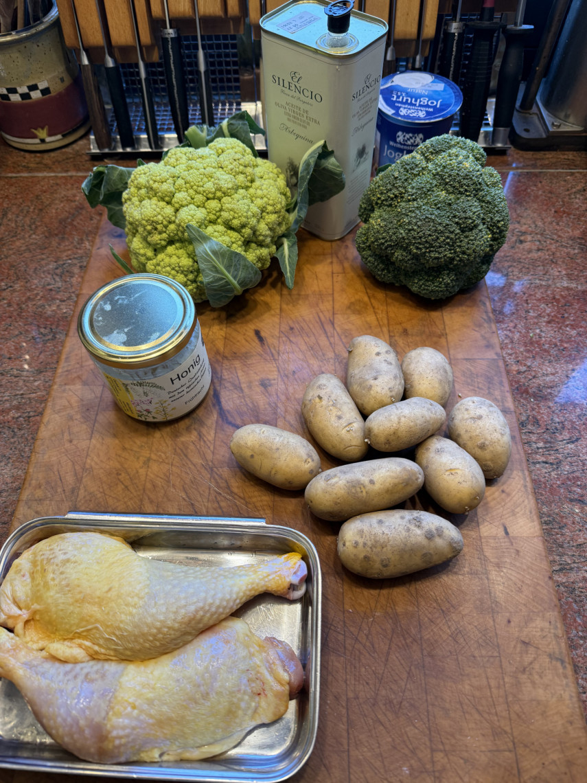 Zutaten für 2 Peronen: 2 Kikok-Schenkel, festkochende Kartoffeln, 1 gelber Blumenkohl, 1 Brokkoli, Olivenöl, Kräuter der Provence, Honig, Joghurt 3,5%, Balsamico Bianco, Meersalz, Aceto balsamico.