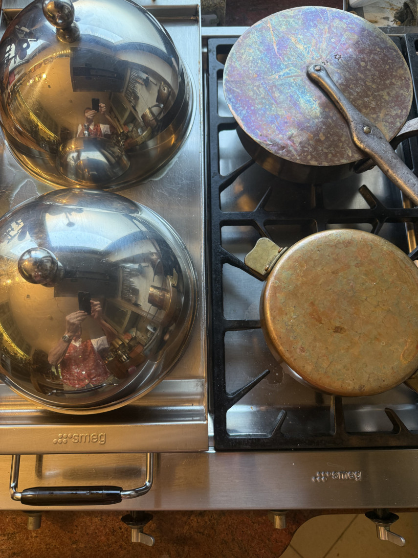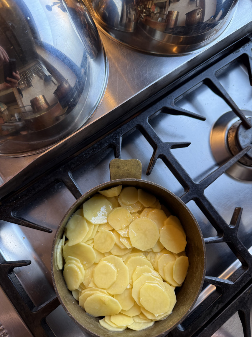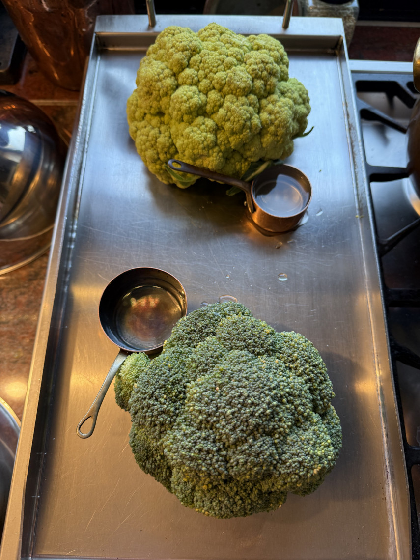 Kartoffeln mit der Mandoline in Scheiben schneiden und mit Meersalz und Olivenöl in einer dickwandigen Kupferpfanne mit Deckel eine Stunde bei kleiner Hitze 60 Minuten garen. Blumenkohl und Brokkoli unten mit einem Küchenmesser glatt abschneiden und auf dem Teppanyaki mit ganz wenig Olivenöl (unter dem Strunk) und einem kleinen Wassertopf mit Dampfglocke 50 Min. garen (alternativ kann mann auch eine halbierte Tomate mit unter die Glocke legen).