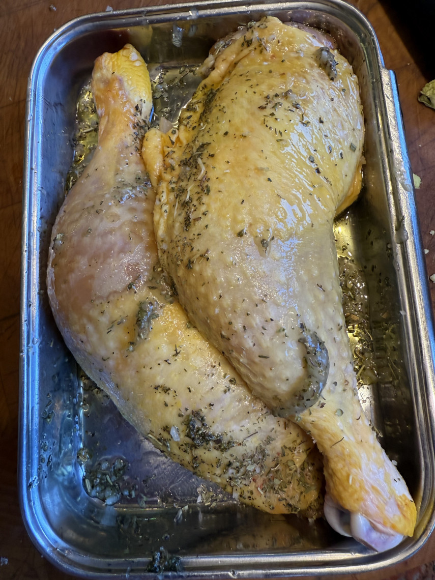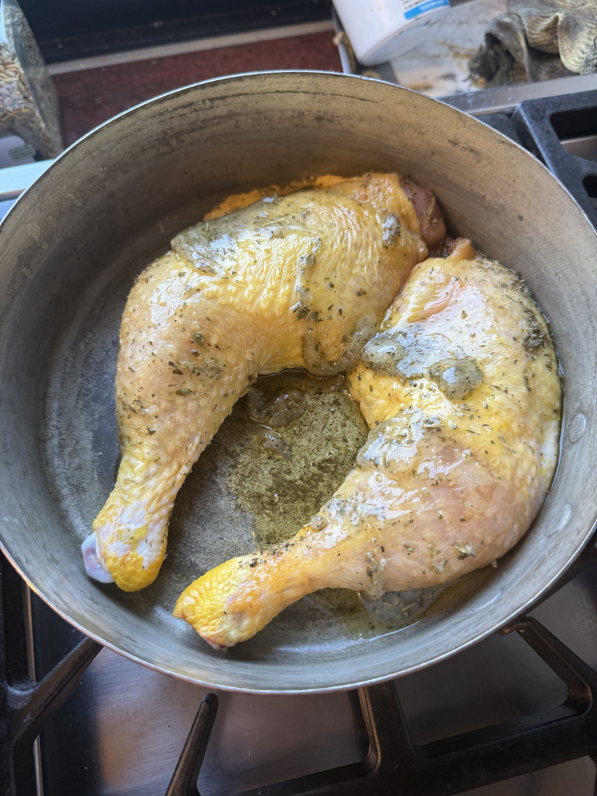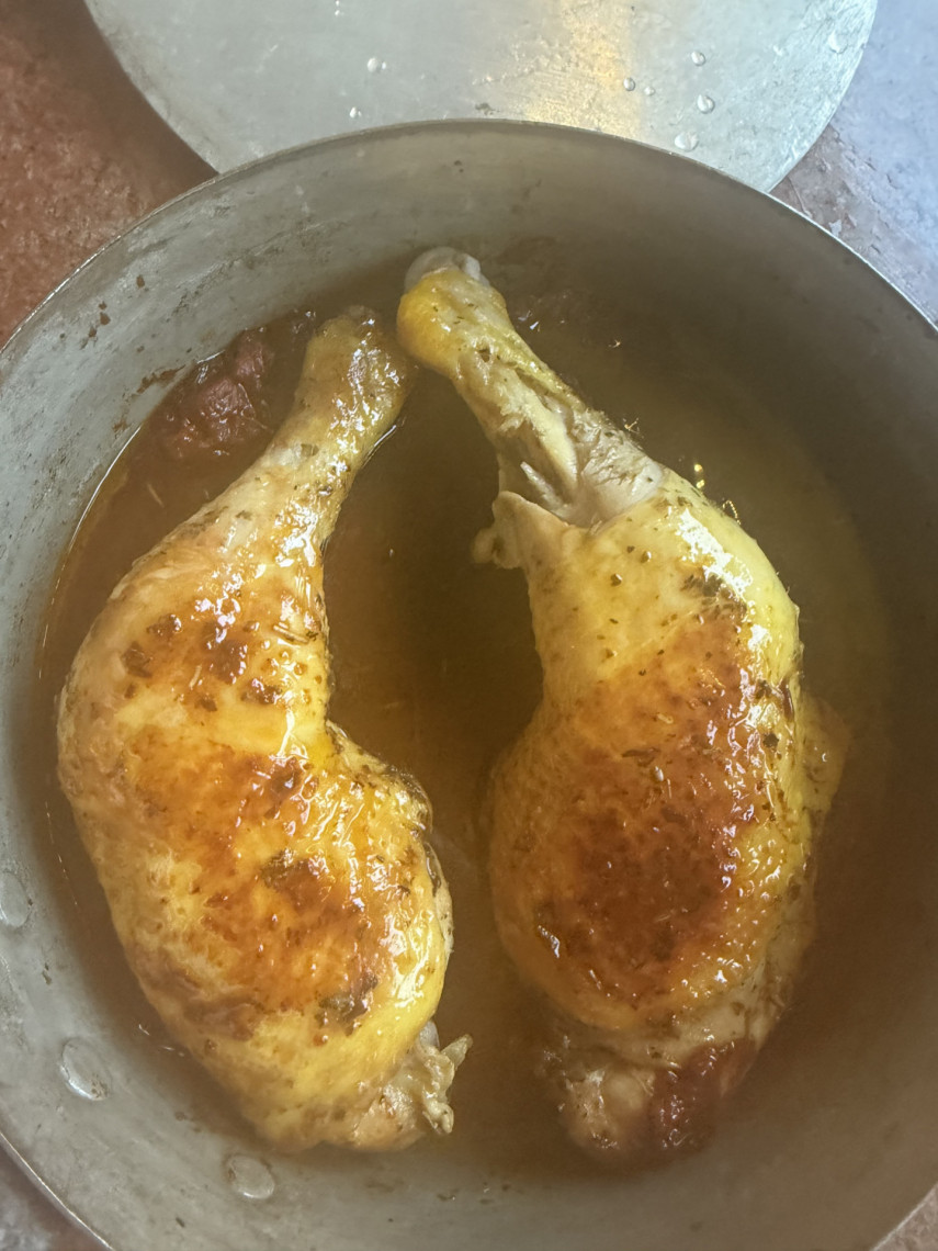 Zubereitung: Hähnchenschenkel abwaschen und trocken tupfen, mit Meersalz, Honig und Kräutern der Provence einreiben und in Olivenöl in einer Pfanne mit Deckel garen. Zwischendurch mit einer Pinzette wenden und mit Aceto balsamico betreufeln.