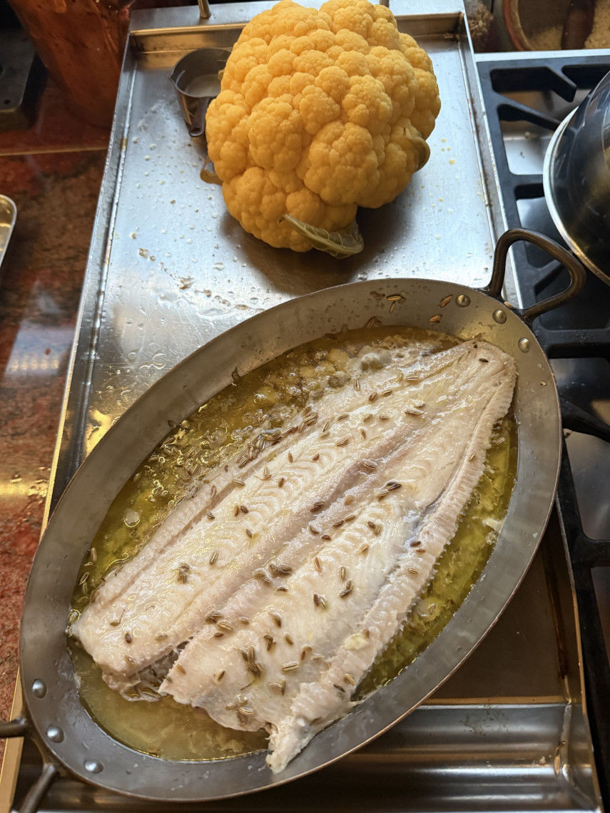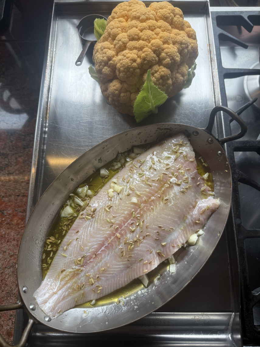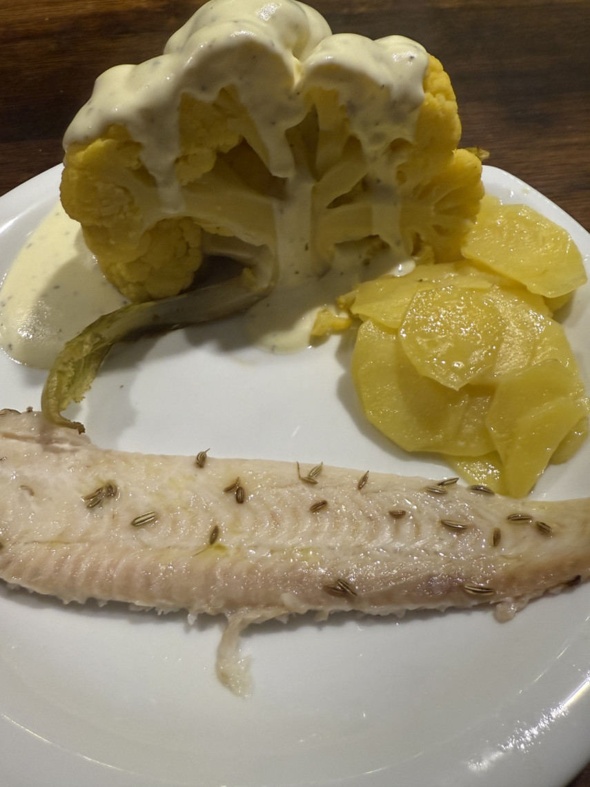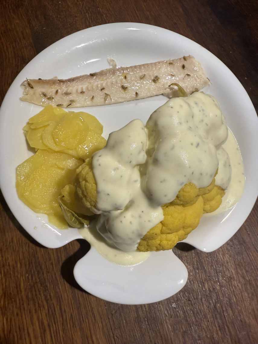 Zutaten: Eine Seezunge, ein gelber Blumenkohl, Olivenöl, Joghurt 3,5%, Zitronensaft, Meersalz, Kräuter der Provence, Dijon Senf, Fenchelsaat, festkochende Kartoffeln in Scheiben geschnitten.