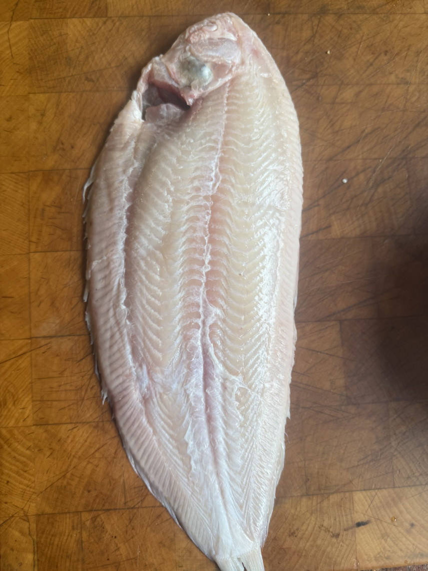 Zubereitung für 2-4 Personen: Eine Seezunge aus Wildfang (Nordatlantik), 520 gr., Kopf mit einem Küchenmesser bis knapp über die Wirbelsäule hinweg von der Fleischseite einschneiden. Dann den Kopf mit den Innereien vom Körper abziehen bzw. abreißen. Flossensaum mit einer Schere abschneiden. Fisch salzen und in einer passenden Pfanne mit Olivenöl und Fenchelsamen 15 Minuten bei kleinster Flamme mit Deckel (hier auf dem Teppanyaki) garen, nach 5-10 Minuten mit einer großen Pinzette wenden.