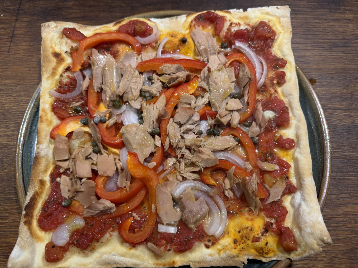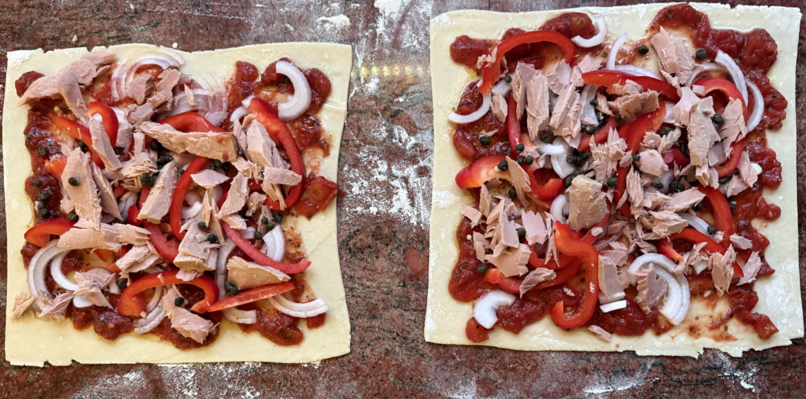 Für den Belag: Tomatensauce, Tunfisch aus dem Glas, Zwiebel, Paprika, Kapern.