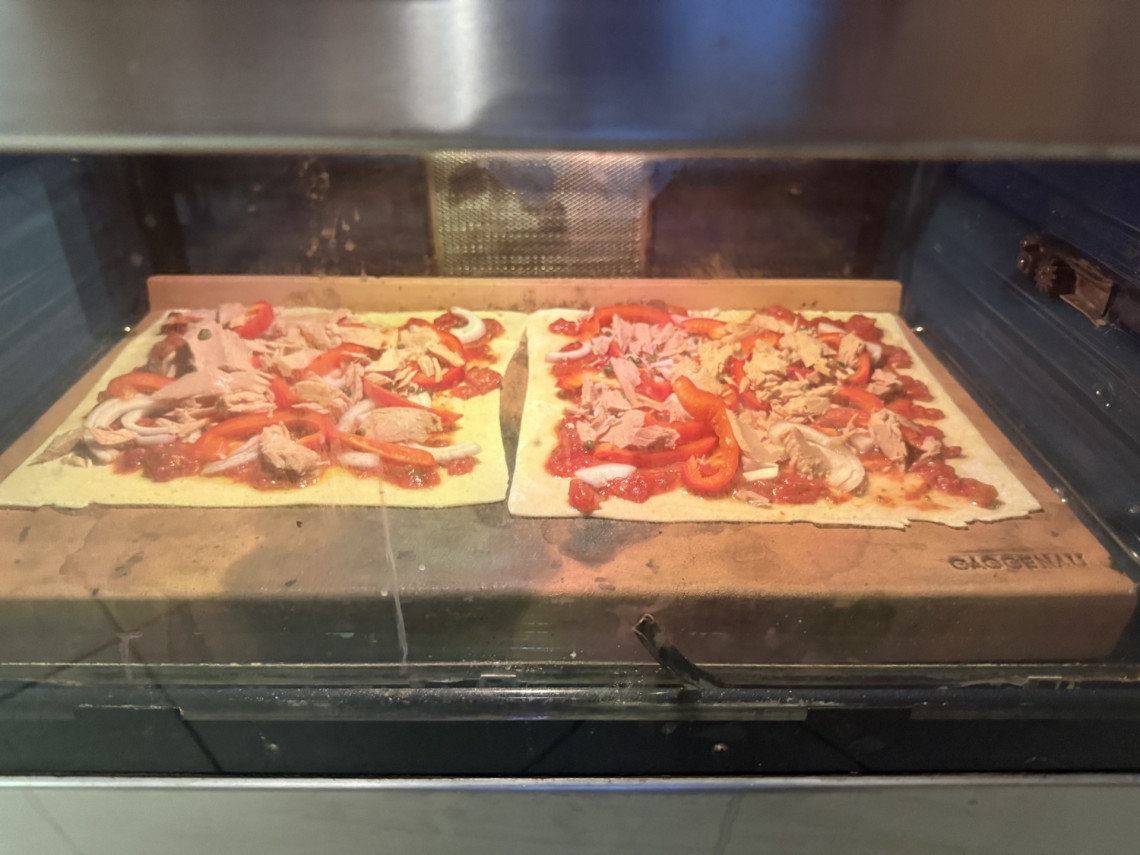 Es ist eigentlich kein Pizzateig, sonst ein Flammkuchenteig, weil keine Hefe verwendet wird. Darum kann man ihn schnell zubereiten. Der Teig muss nicht gehen. Tomatensauce auf den ausgerollten Teig geben und die Zutaten nach Belieben darüberlegen. Bei max. Hitze im Backofen mit Umluft garen.