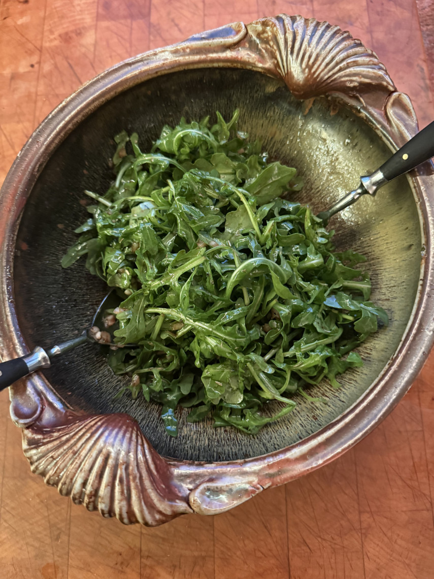 Dressing für den Rocula: Olivenöl, Aceto balsamico, Balsamico bianco, Verhältnnis 5:1:1, eine klein geschnittene Zwiebel, Meersalz, Kräuter der Provence.