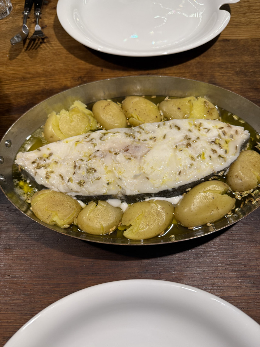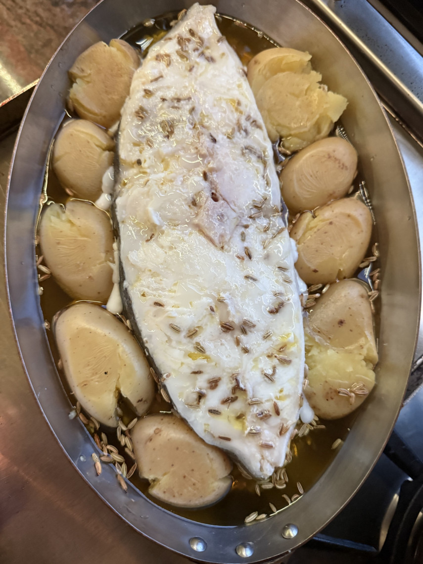 Für den Heilbutt: Ein Steak, 630 gr. für 2-4 Personen, Olivenöl, Fenchelsaat, Meersalz. Bei geringster Hitze in einer kleinen Kupfpfanne mit Deckel auf dem Teppanyaki garen. Dazu gedämpfte Drillinge und Rocula.
