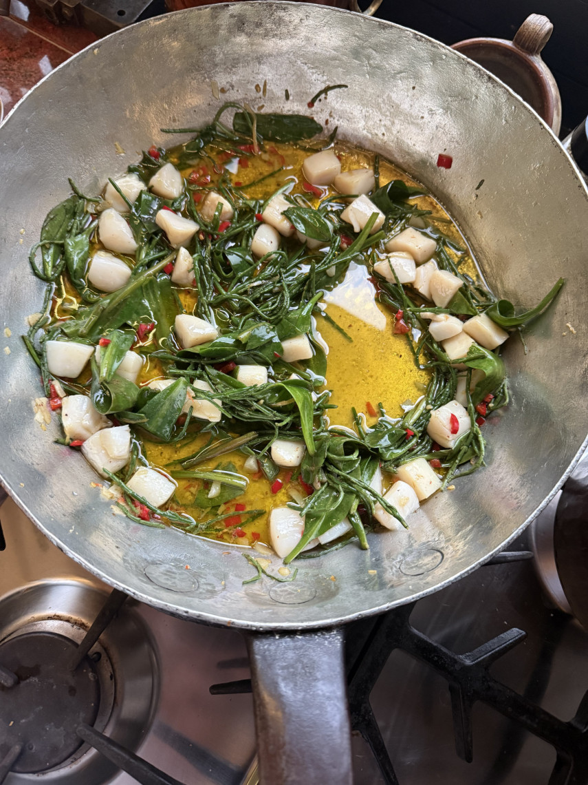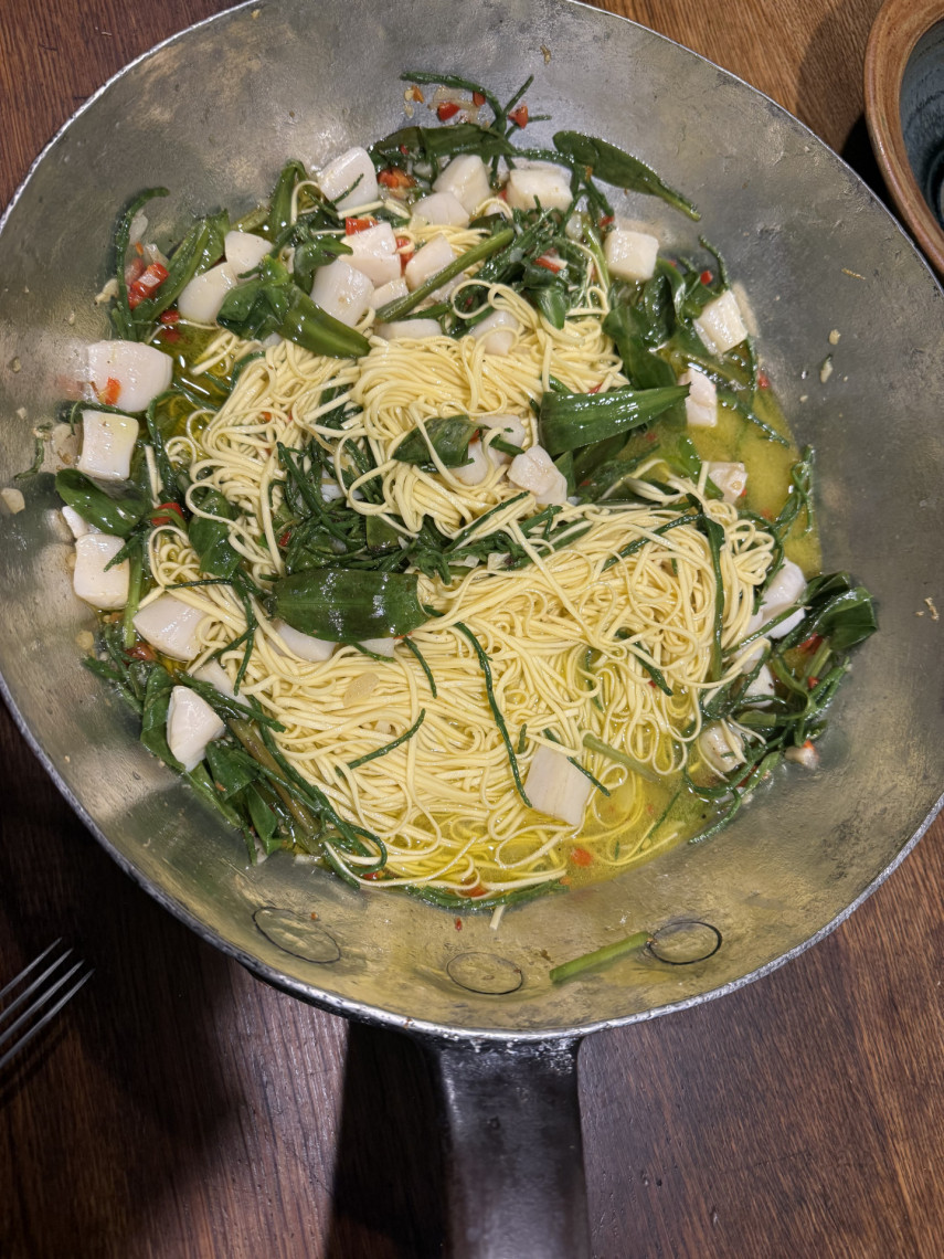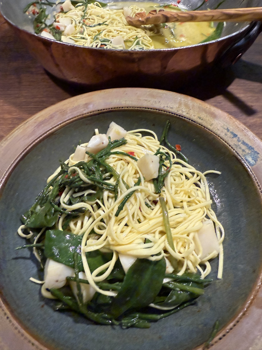 Zutaten für 2 Personen: 180 gr. Spaghetti, 70 ml Olivenöl, 1 Peperoni, 3 große kleingehackte Knoblauchzehen, 10 geviertelte Jakobsmuscheln, 60 gr. Salicornes, 60 gr. Strand-Astern, etwas Muskatblüte (Macis), kein Salz, etwas geraspelte Knollensellerie und ziselierte Zitronenschale.