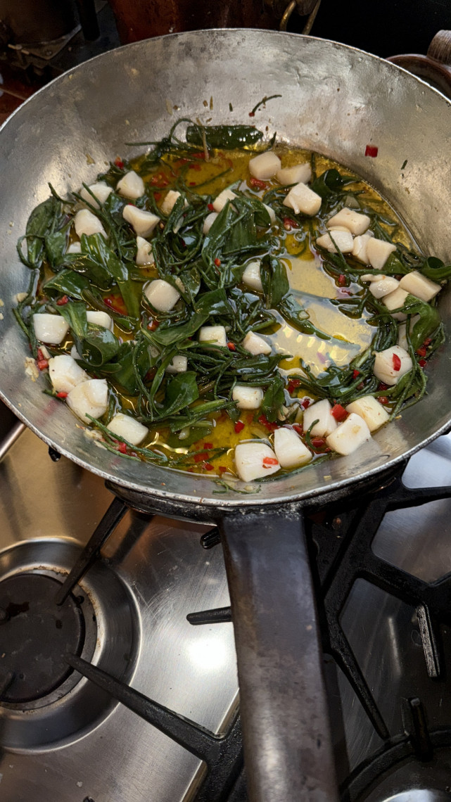 Zubereitung: Die größeren Blätter der Strand-Astern halbieren. Die Stängel der Strand-Astern abschneiden. Die Peperoni, Muskatbüte und Knoblauchzehen ebenfalls klein hacken, die Zitronenschalen und den Knollensellerie hinzugeben und alles zusammen in Olivenöl bei geringer Hitze dünsten. Die geviertelten Jakobsmuscheln und etwas Nudelwasser und dann die gegarte Spaghetti hinzugeben, umrühren und servieren.