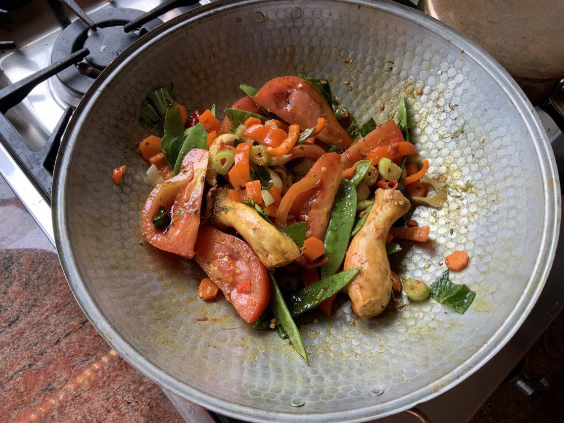 Zutaten für 2 Personen: Zwei Kräuterseitlinge, eine Coeur de Boeuf Tomate, eine rote Paprika etwas Staudensellerie, drei kleine Mören, ein paar Kaiserschoten, eine kleine halbe Knollenfenchel, eine kleine rote Peperoni, Olivenöl, grobes Meersalz, Lila Reis.
