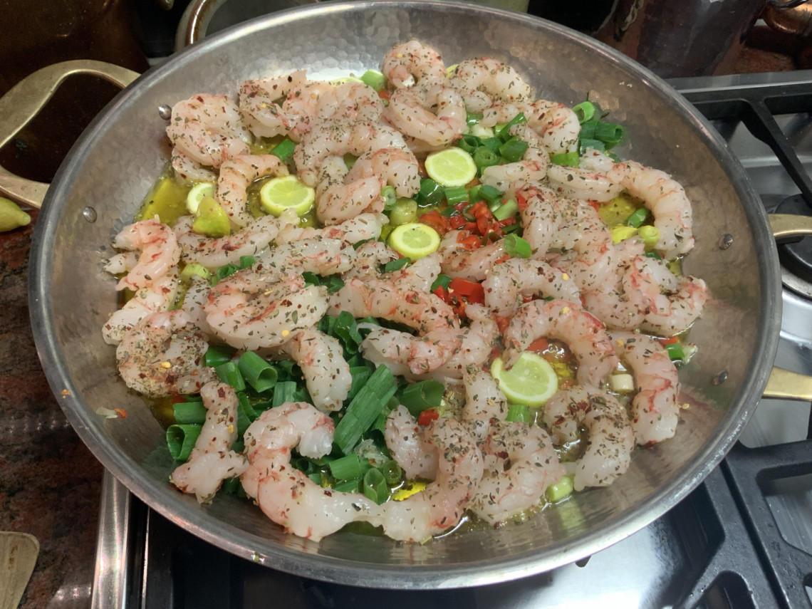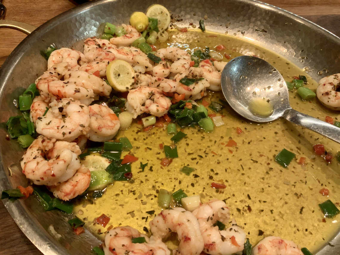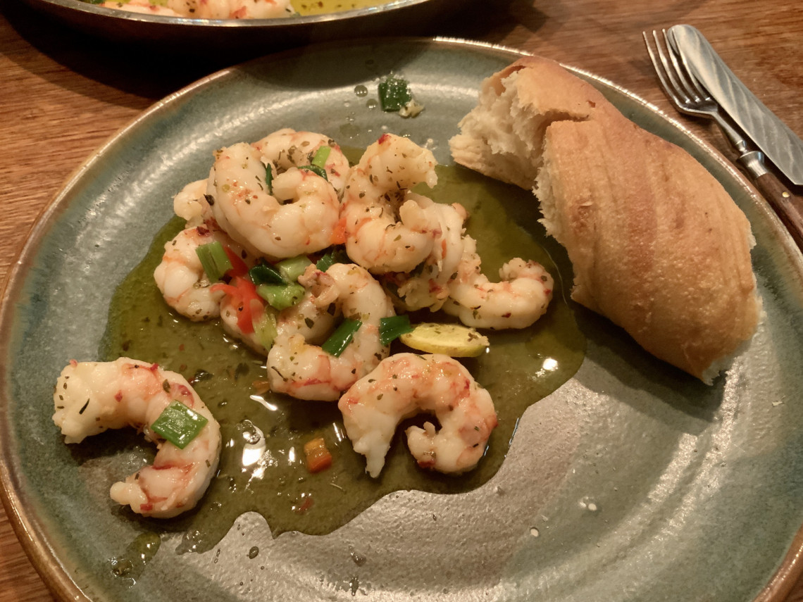 Zutaten: 800 g TK-Garnelen, Frühlingszwiebeln, rote Peperoni, eine Bio-Zitrone, Knoblauch, Olivenöl, Kräuter der Provence, Meersalz, Baguettebrot.