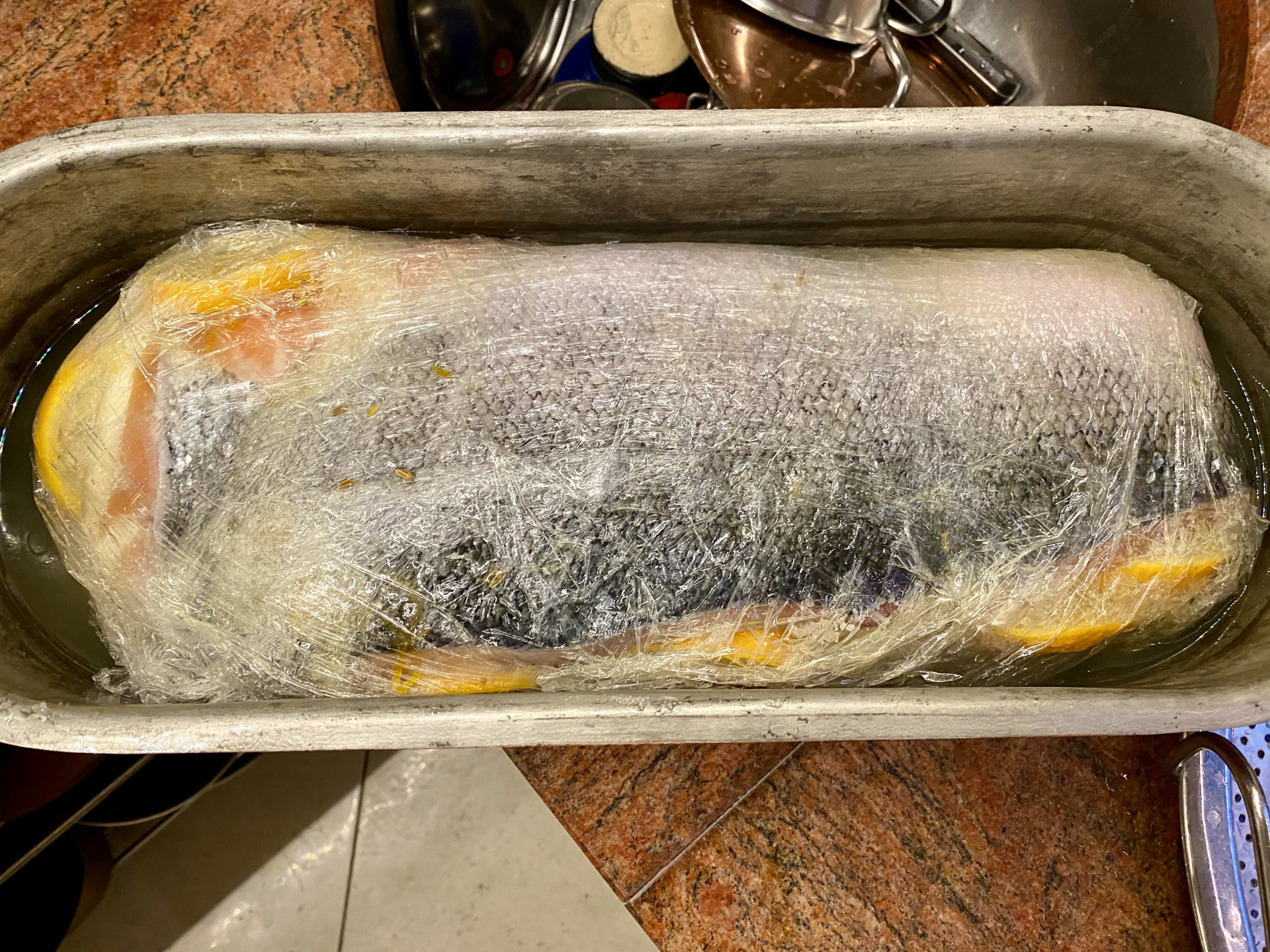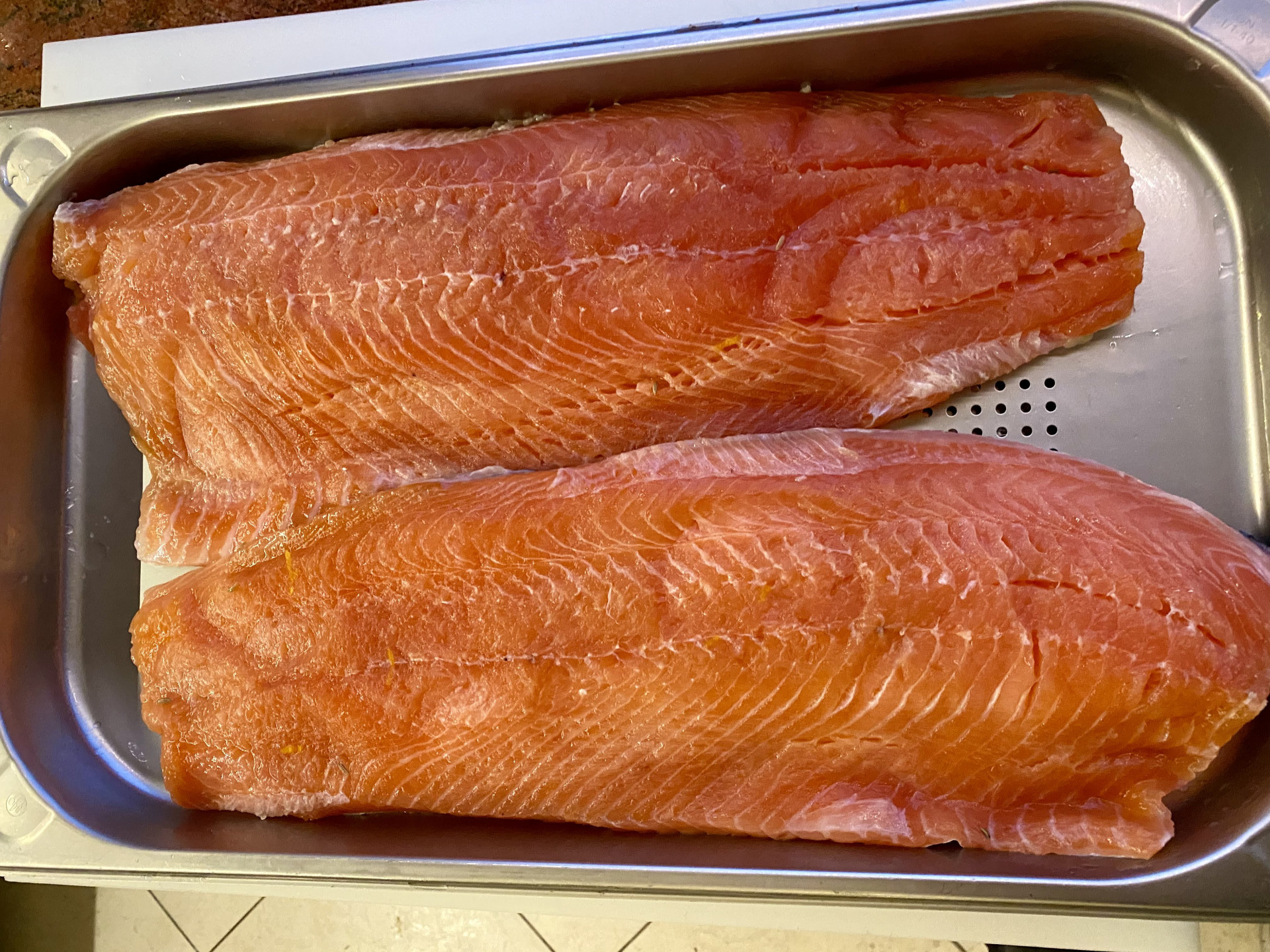 Für den Lachs: Zwei gleichgroße Lachsseiten mit Haut, am besten eine linke und eine rechte Lachsseite nehmen.