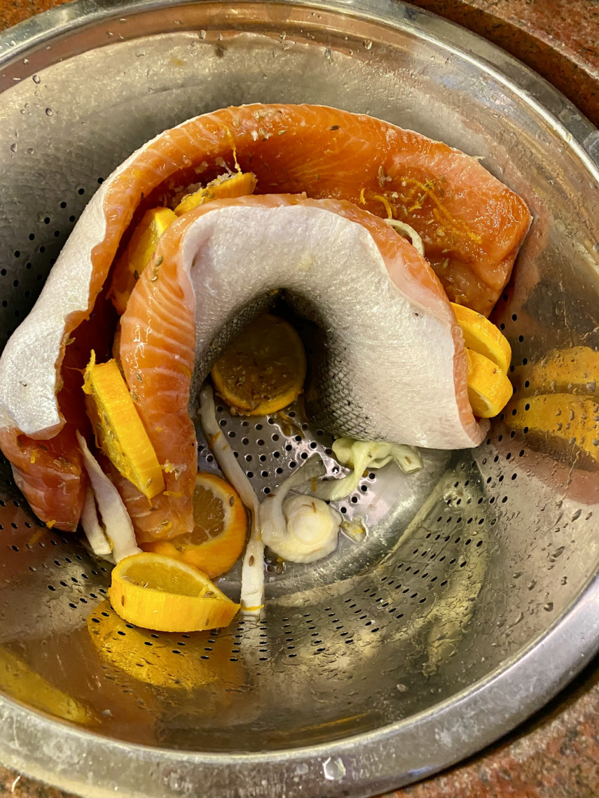 Für 1 kg Lachs: ein EL Fenchelsaat, eine kleine Bio-Fenchelknolle mit Grün, ein EL weiße Pfefferkörner, 120 gr. brauner Zucker, 90 gr. Meersalz, 1 1/2 Bio-Orangen.