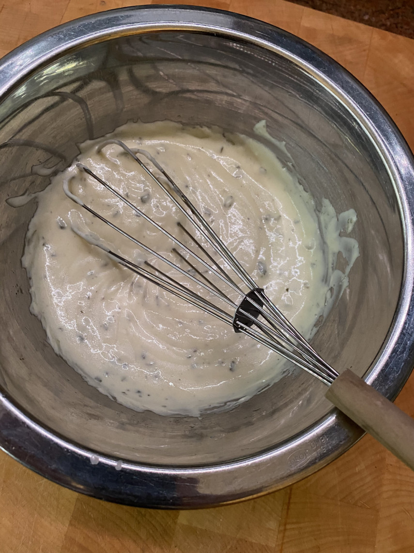 Zutaten: gebeizter Lachs, festkochende Kartoffeln, Olivenöl, Remoulade aus Joghurt, Olivenöl, Dijon-Senf, Kapern, Meersalz und Zitronensaft, Radicchio, Zwiebeln.