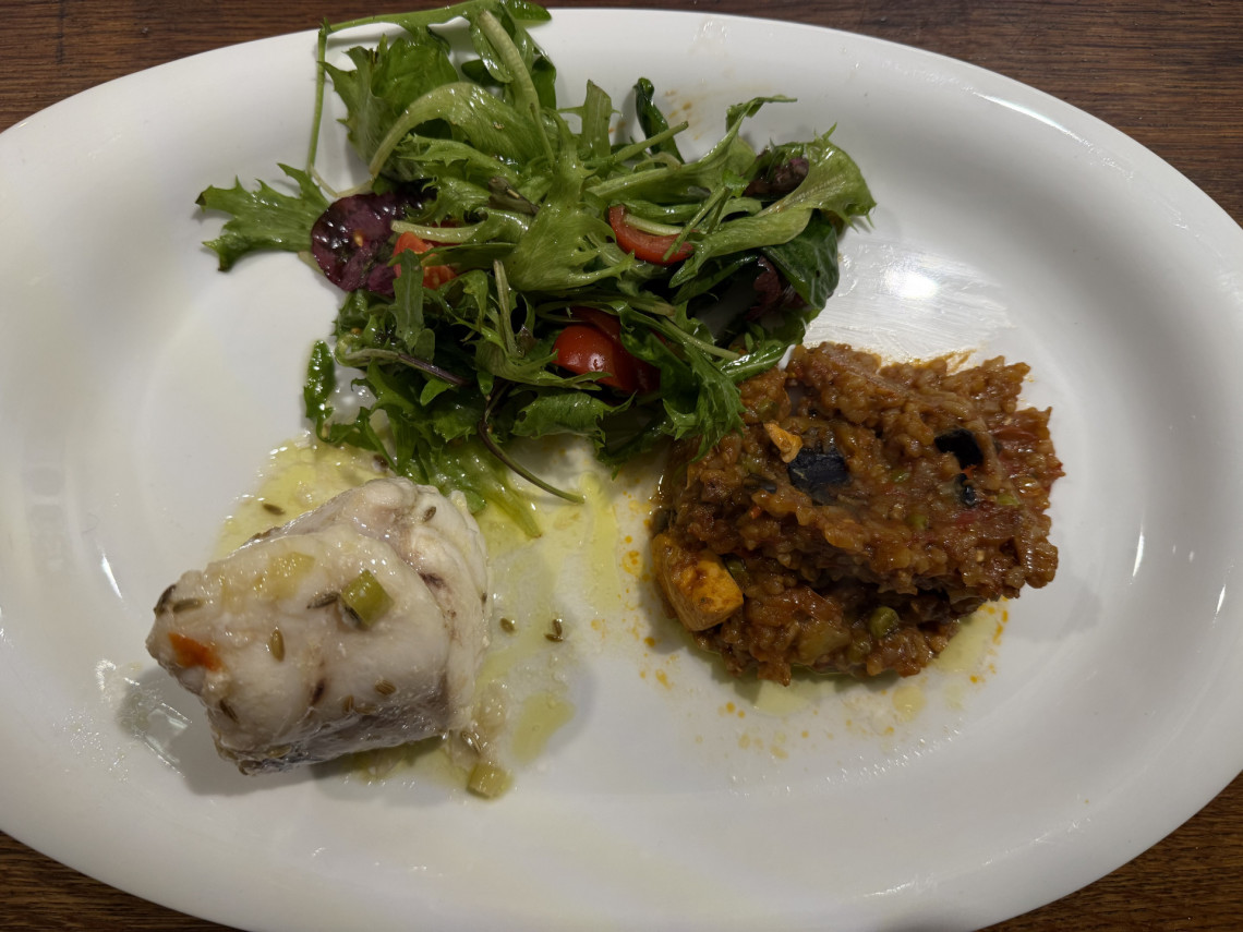 Zutaten für 2 Personen: 510 gr. Stück vom Seeteufel, Meersalz, Fenchelsaat, Knoblauch, eine rote Peperoni längst geteilt und Olivenöl. Wildkräutersalat mit Olivenöl, Aceok Balsamico, Salatkräuter und Meersalz. Bombareis in süß-saurer Tomaten-Auberginen-Sauce mit Lachs (aus dem Kühlschrank, Rp. #522 vor 8 Tagen )