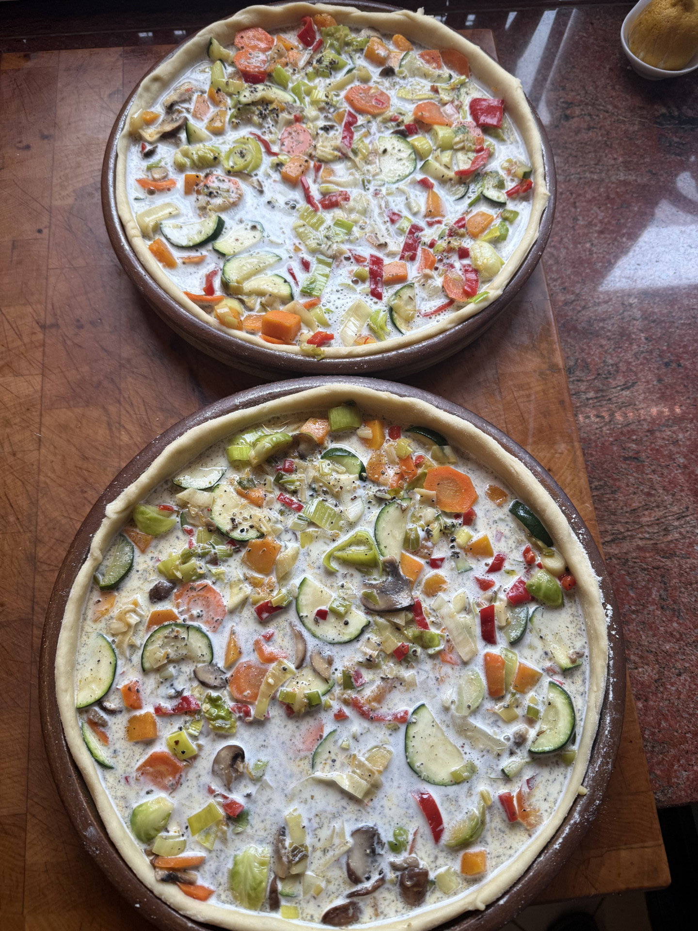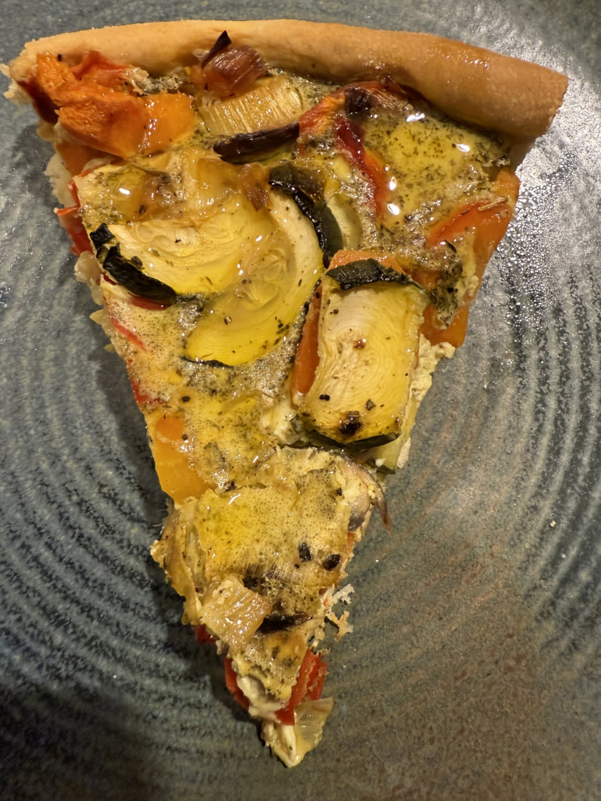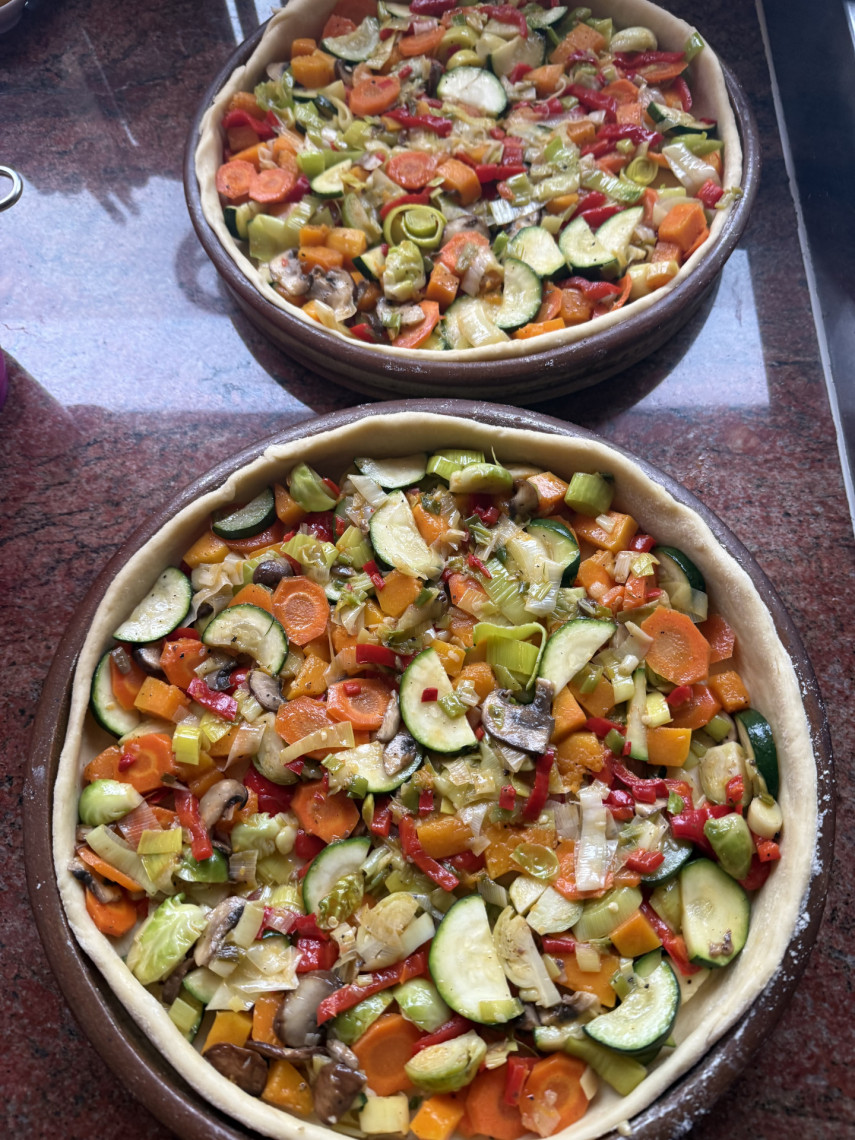 Das Gemüse auf den Teig geben, die Sosse darüber verteilen. Im Backofen bei 175° Grad Umluft etwa 45 min garen.