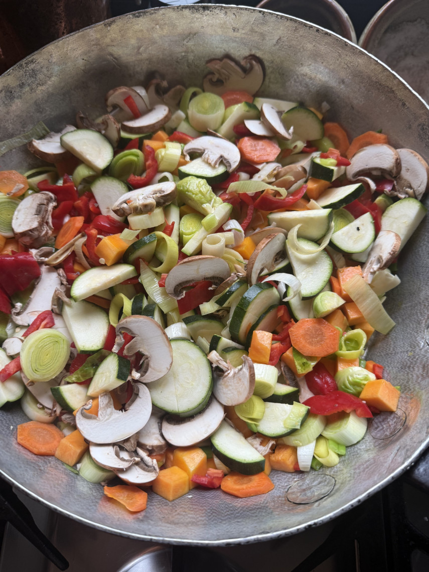 Klein geschnittenes Gemüse mit Olivenöl in der großen Sauteuse dünsten (ohne Deckel), mit Salz und Pfeffer würzen.