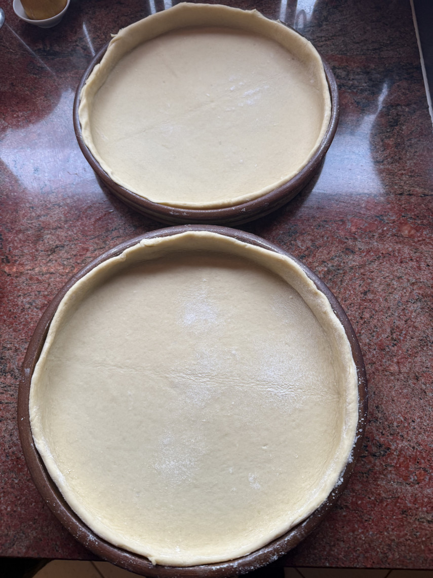 Teig für 2×30 cm Form: 550g Dinkelmehl, 1 Würfel frische Hefe, 250ml lauwarme Milch, etwas Salz, eine Prise Zucker, 80 g Olivenöl. Aus den Zutaten einen Teig kneten, diesen etwa 1/2 bis 1 Stunde gehen lassen, dann ausrollen und in eine Quicheform geben, nochmals gehen lassen, während man in der Zwischenzeit das Gemüse zubereitet.