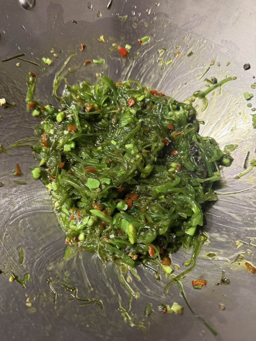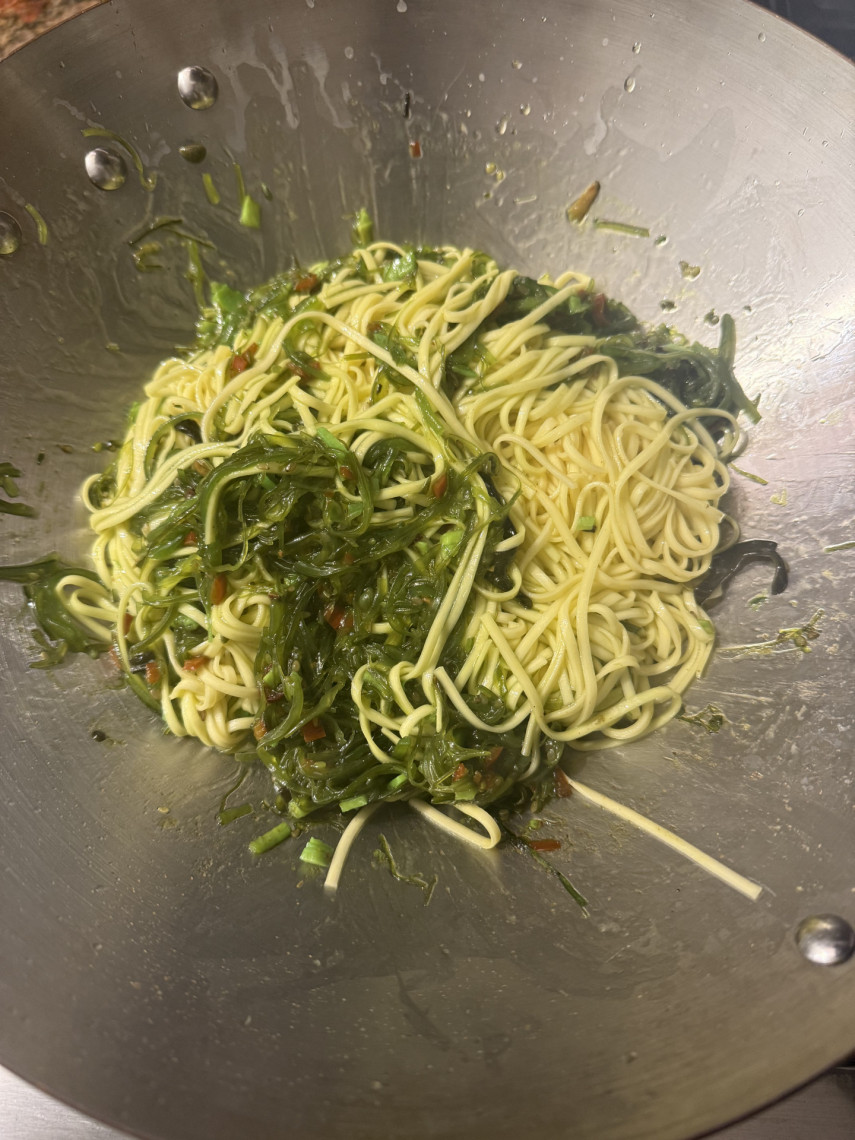 Zutaten für 2 Personen: 170 gr. Spaghetti, 250 gr. Goma Wakame (Salat – TK-Ware), 30 ml Olivenöl, 4 kleingehackte Knoblauchzehen, eine Peperoni, 2 TL klein gehackte Kapern, eine Scheibe klein gehackter Sellerie (eine kleine Ecke liegt immer in der Küche herum und trocknet vor sich hin), 2 Messerspitzen Macis Blüte, 1 Messerspitze Muskatnuss, 3 Messersiptzen Harissam, grobes Meeersalz.