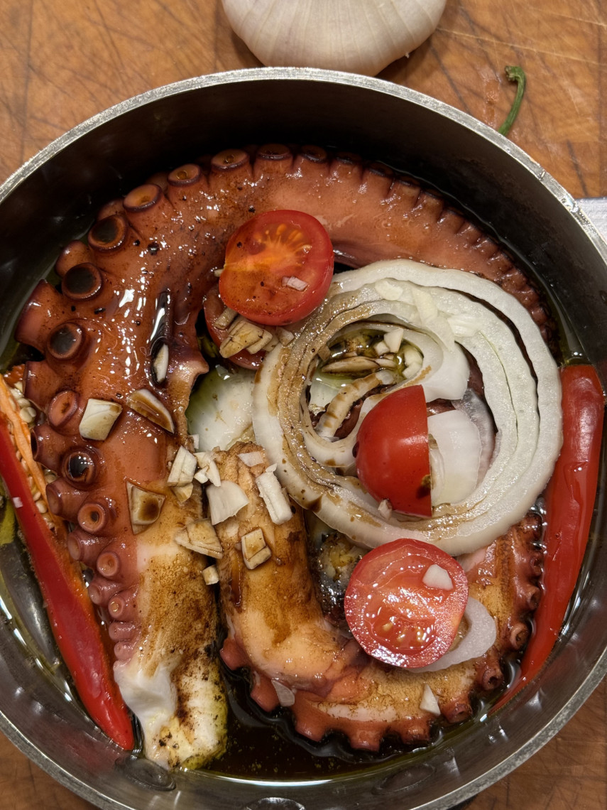 Zubereitung: 2 Pulpo Arme (TK-Ware, 200 gr., vorgegart) unter fließendem Wasser etwas antauen, den Gelee abspülen und dann mit Olivenöl, 5 EL Aceto balsamico, Zwei Scheiben einer Gemüsezwiebel, einer halbierten Peperoni, zwei halbierten Kirschtomaten, drei klein geschnittenen Knoblauchzehen und Kräuter der Provence in einem kleinen Kupfertopf erst mit Deckel, dann ohne Deckel zum Reduzieren, bei kleiner Hitze garen, zum Schluss etwas salzen. Die Sauce muss vollständig reduzieren. Die Zwiebeln mit dem Aceto balsamico karamellisieren dann, so das eine schöne Süße entsteht. Servieren mit Gemüsequiche (Rp. #531). Quiche mit Olivenöl übergießen.
