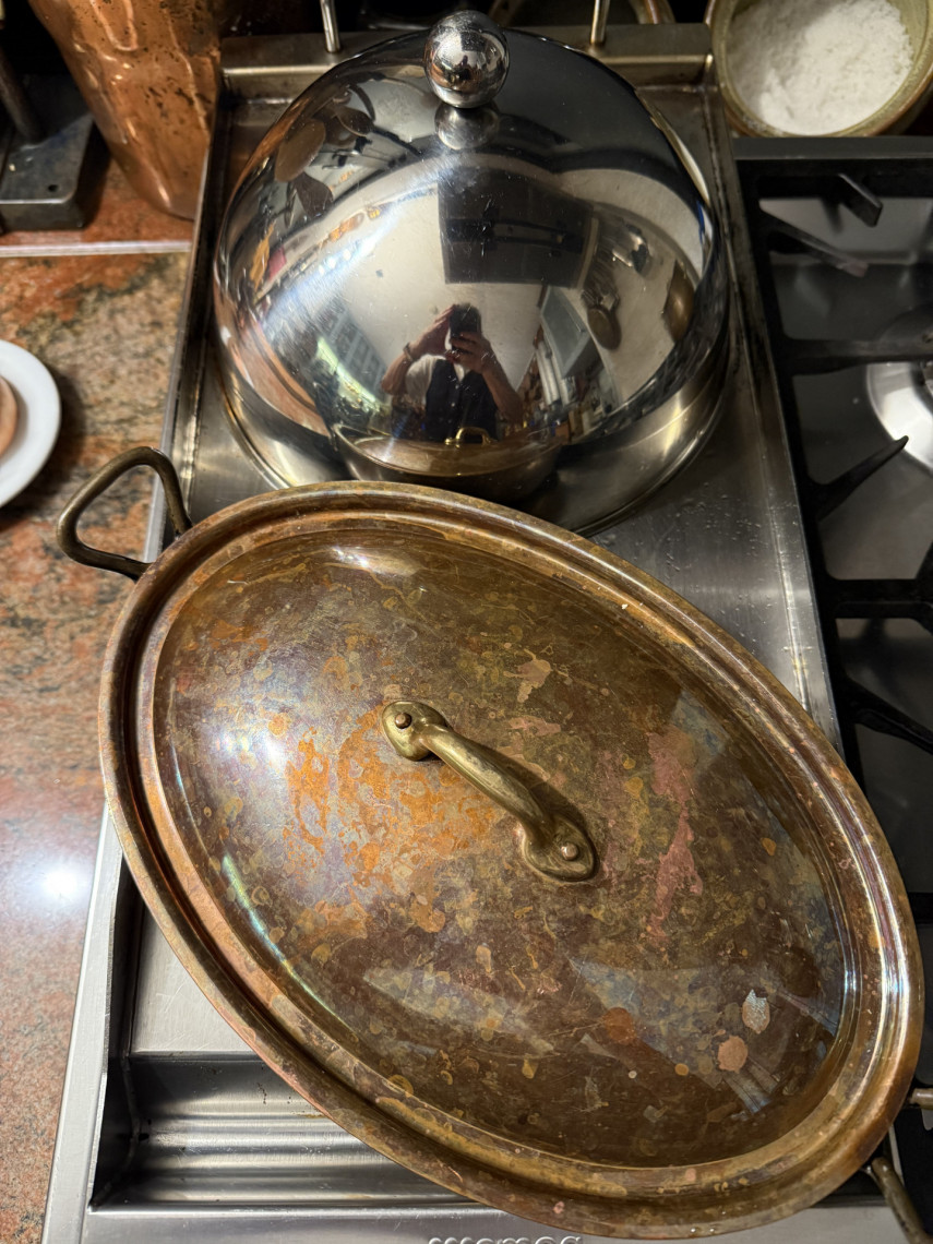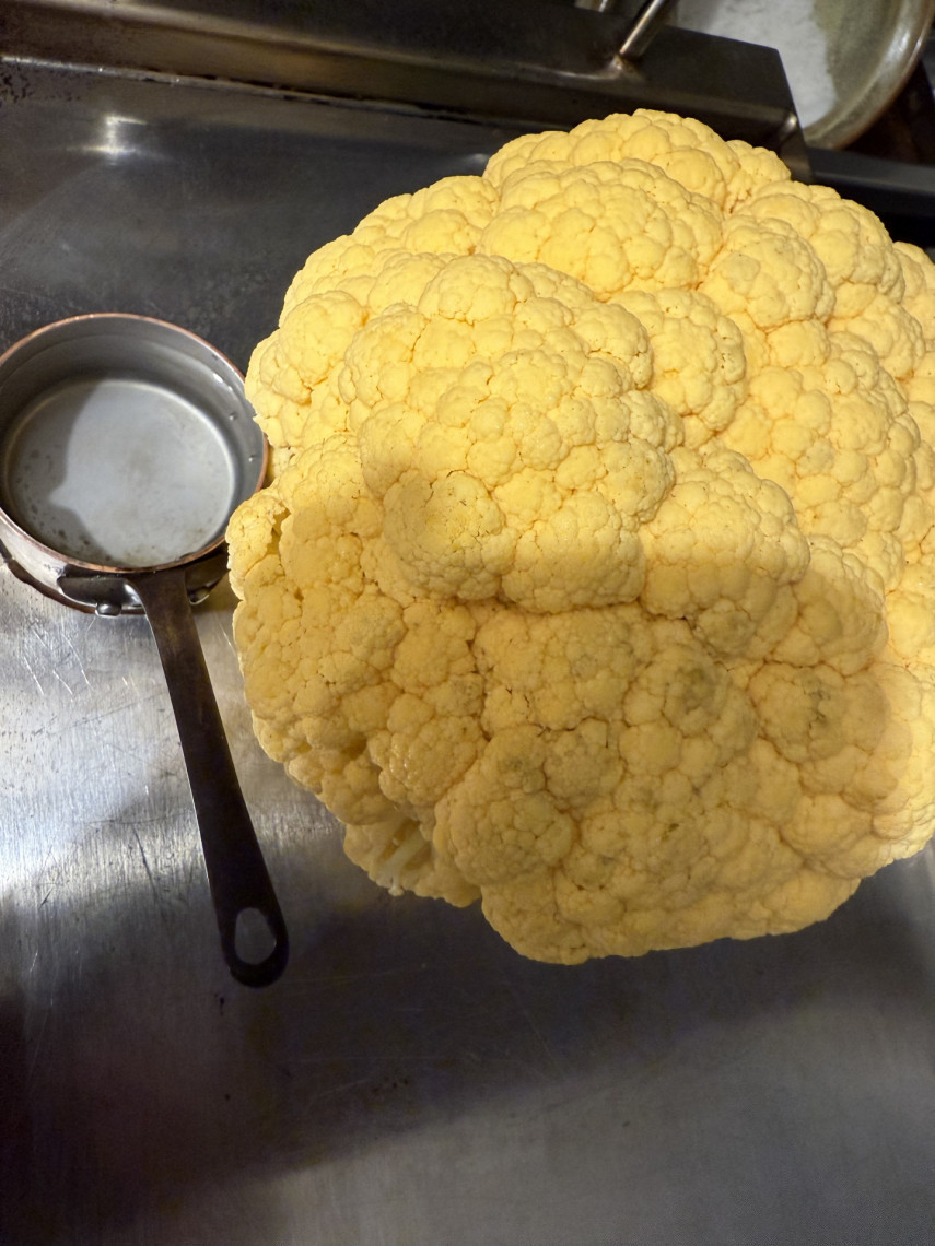 Blumenkohl im ganzen auf dem Teppanyaki mit Wasserspender (hier kleiner Kupfertopf) und Dunstglocke 30 bis 40 Minuten dämpfen. Dressing aus: 3,5%igem Joghurt, Olivenöl, Zitronensaft, Kräuter der Provence, Dijon Senf und Meersalz mit einem Schneebesen schlagen..