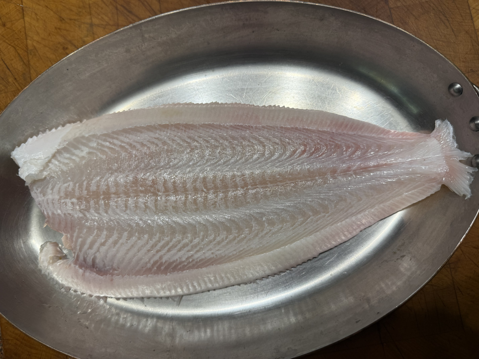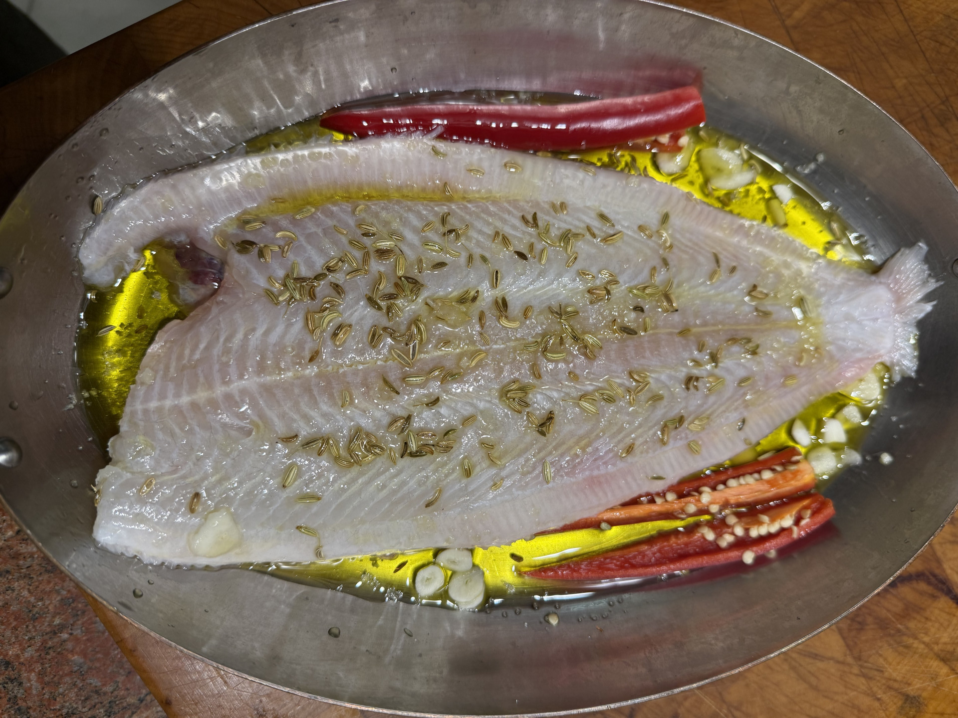 Zubereitung für 2 Personen: Den Kopf der Seezunge mit einem Küchenmesser bis knapp über die Wirbelsäule hinweg von der Fleischseite einschneiden. Dann den Kopf mit den Innereien vom Körper abziehen bzw. abreißen. Flossensaum mit einer Schere abschneiden. Fisch salzen und in einer passenden Pfanne mit Olivenöl und Fenchelsamen 15 Minuten bei kleinster Flamme mit Deckel (hier auf dem Teppanyaki) garen, nach 5 Minuten mit einer großen Pinzette wenden.