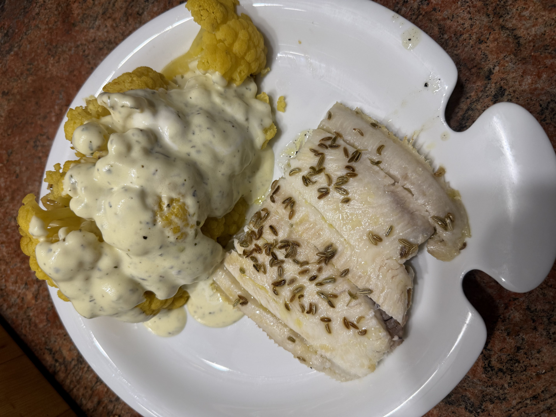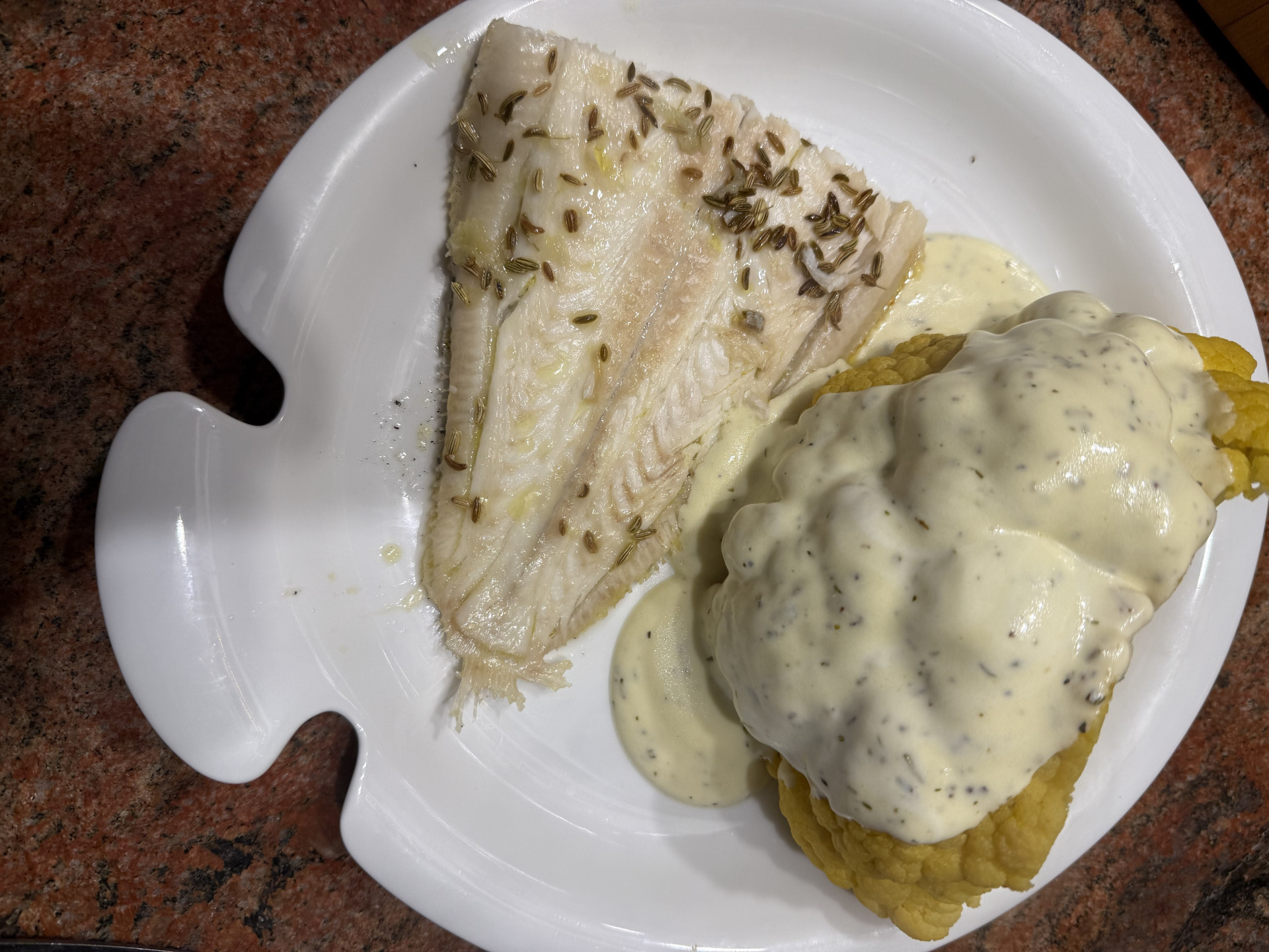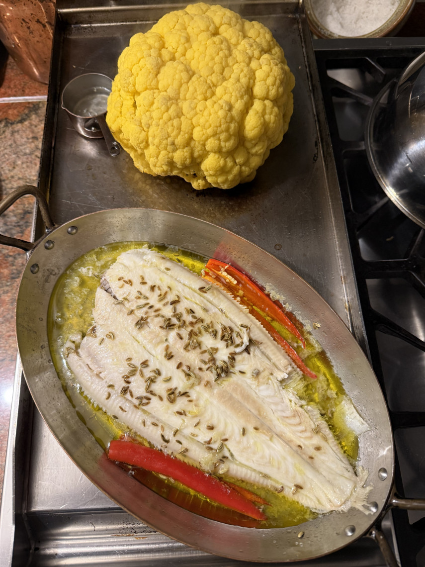 Zutaten: Eine Seezunge aus der Zucht, 495 gr., ein gelber Blumenkohl, Olivenöl, 5 EL Joghurt 3,5%, Zitronensaft, Meersalz, Kräuter der Provence, Dijon Senf, Fenchelsaat, Peperoni, Knoblauch.