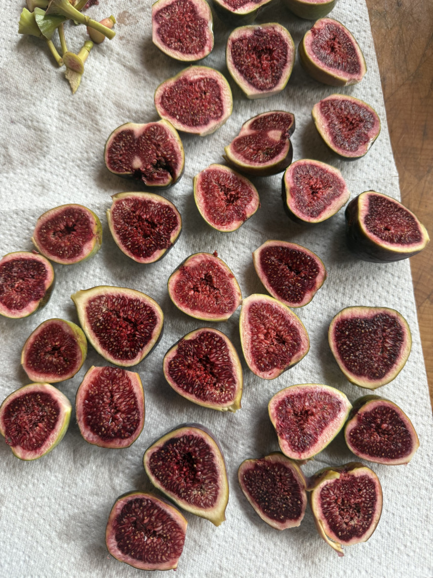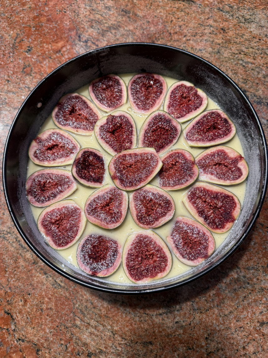 Zutaten: 2 Eier, 100 g Zucker, 125 g Mehl, 1/2 Tütchen Backpulver, 1 Prise Salz, 50 ml Milch, 30 ml mit Orangen aromatisiertes Olivenöl, 10 halbierte Feigen aus dem Garten.