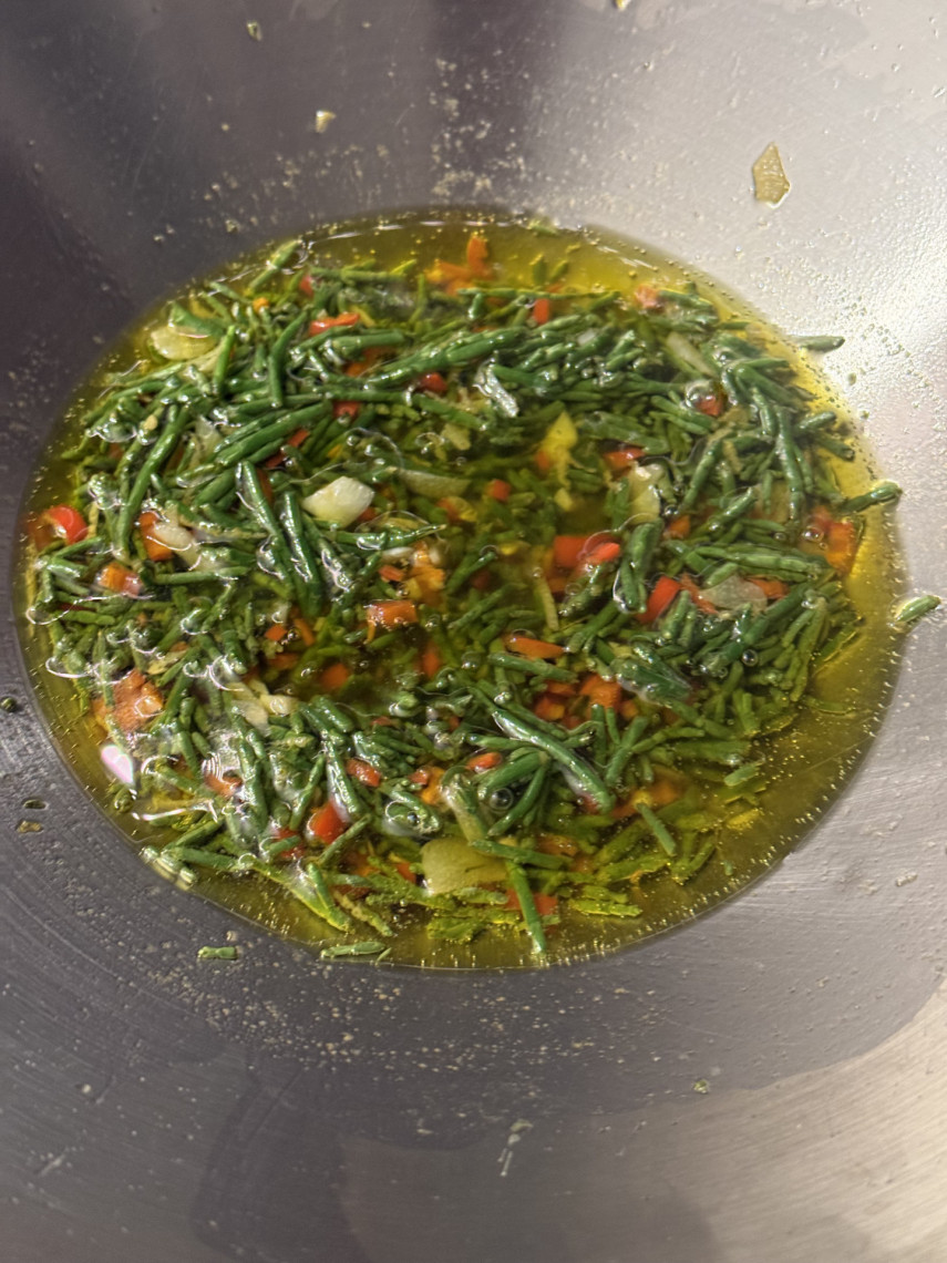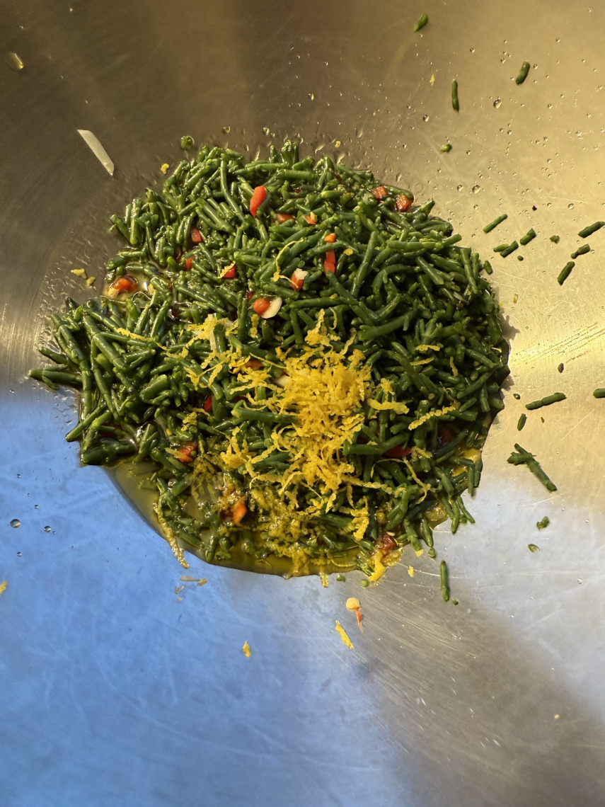 Zutaten für 2 Personen: 190 gr. Spaghetti, 75 ml Olivenöl, 1 ganz klein geschnittene rote Peperoni, 10 geviertelte Jakobsmuscheln (240 gr), 90 gr. Salicornes, Priese grobes Meersalz, Zester einer Bio-Zitrone, 4 bis 5 Knoblauchzehen.