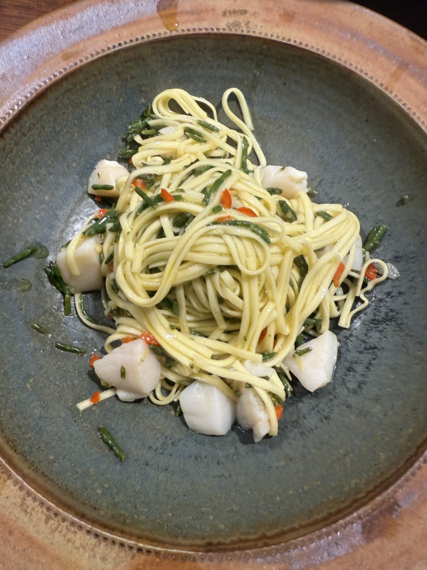 Das Gericht ist eine ideale Basis für zwei Zutaten, die im Geschmack dezent sind und deshalb solch eine Bühne benötigen: Jakobsmuscheln und Salicornes (europäischer Queller, auch Meeresspargel genannt). Kaum ein Nudelgericht bringt das Olivenöl so in den Vordergrund, dashalb muss mit der Hitze ganz zurückhaltend gearbeitet werden.