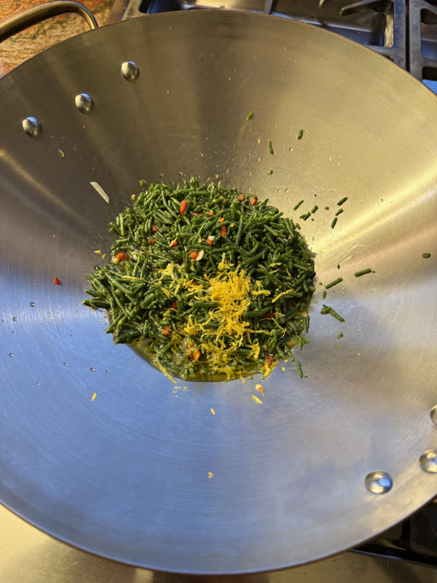 Zubereitung: In einem Wok (hier edelstahlbeschichteter Kupferwok) die klein geschnittene Peperoni und Knoblauchzehen zusammen mit einem Wiegemesser geschnittenes Salicornes und dem Zitronenzester 5-10 Minuten in etwas Olivenöl vorsichtig garen bis die Salicornes etwas weich geworden sind. Die geviertelten Jakobsmuscheln und Meersalz mit dem restlichen Olivenöl hinzugeben und nur ganz kurz garen, nur um eine Temperatur von 60°C. zu erreichen. Dann die gegarten Spaghetti mit etwas Nudelwasser hinzugeben, schwenken oder umrühren und servieren.