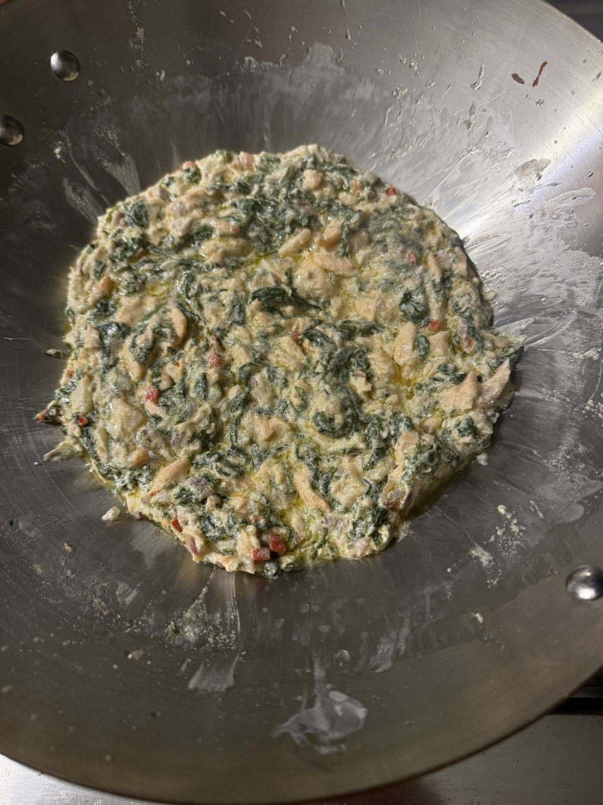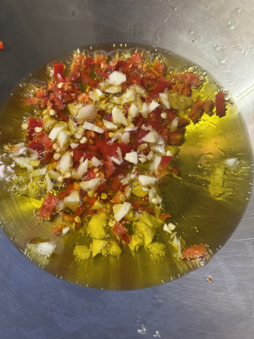 Zutaten für 2-3 Personen: 190 gr. Spaghetti, 250 gr. Lachsfilet, 200 gr. junger Blattspinat, eine kleine geschnittene Zwiebeln, 4 zerdrückte und klein gehackte Knoblauchzehen, 1 rote Peperoni, grobes Meersalz, Zester einer Zitronenschale, 4 EL Olivenöl, 200 gr. Crème fraîche, 1 TL Macisblüte, 2 MS Muskatnuss, Zitronensaft.