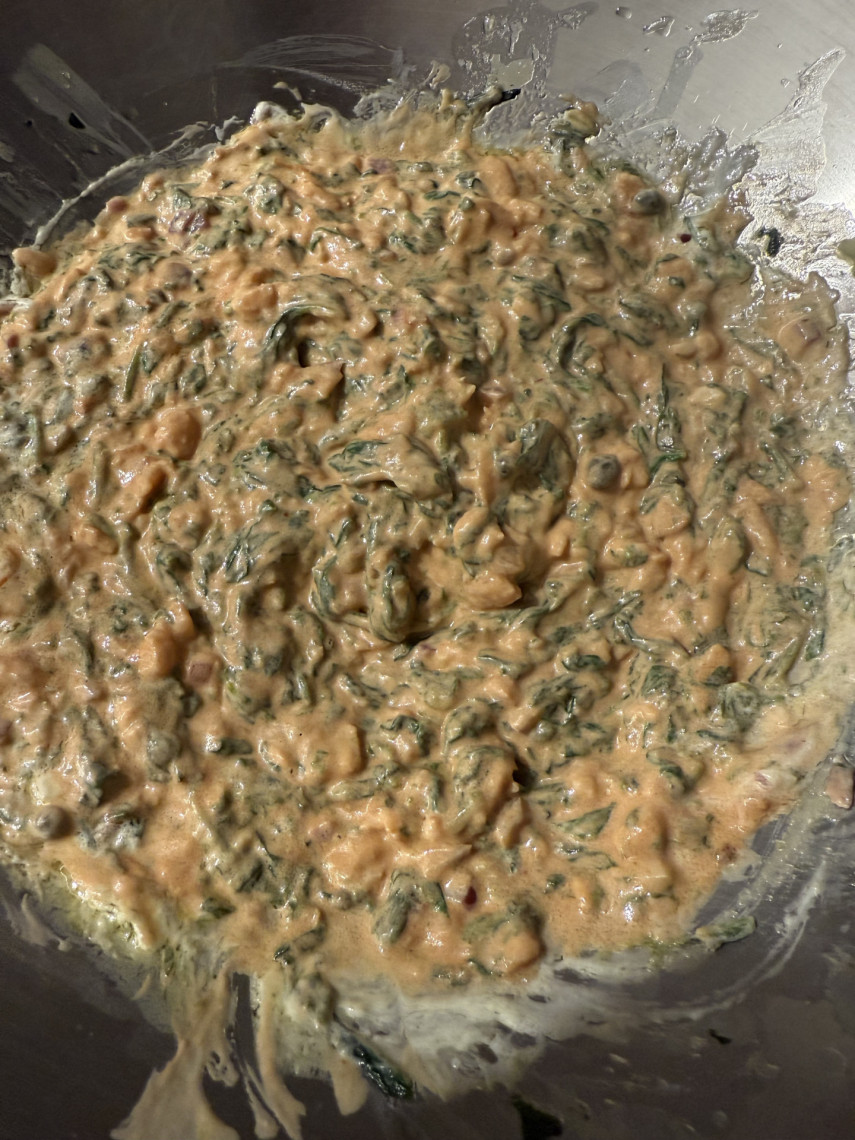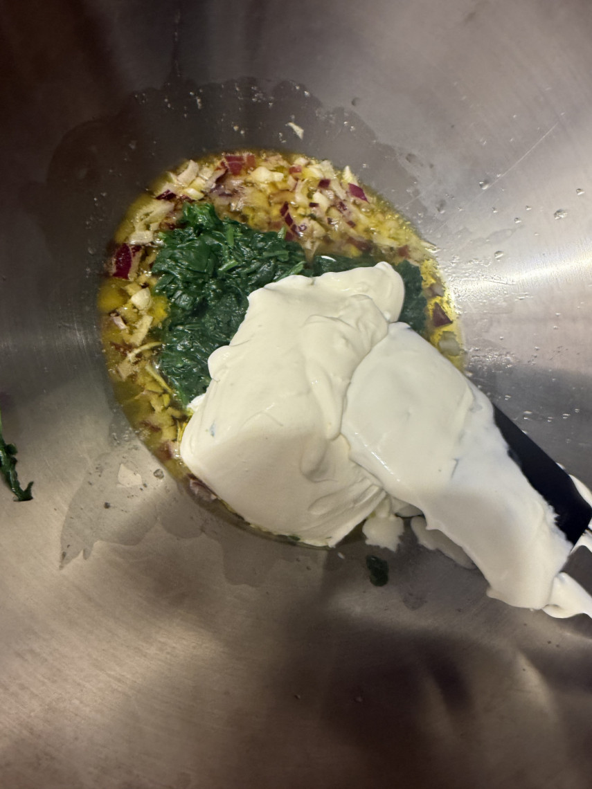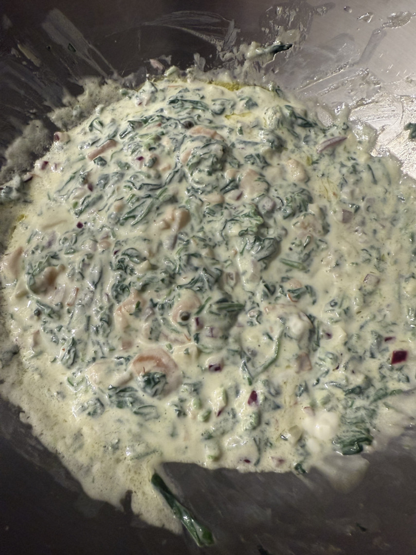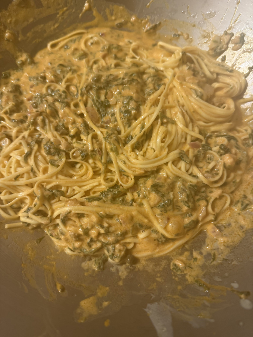 Zutaten für 2-3 Personen: 190 gr. Spaghetti, 100 gr. Bio-Räucherachs, 200 gr. junger Blattspinat, eine kleine geschnittene rote Zwiebel, 1 EL kleine Kapern, 3 zerdrückte und klein gehackte Knoblauchzehen, Saft einer drittel Zitrone, 4-5 EL Olivenöl, 200 gr. Crème fraîche, 1 TL Macisblüte, Meersalz, 1 EL San Marzano Tomatenmark.