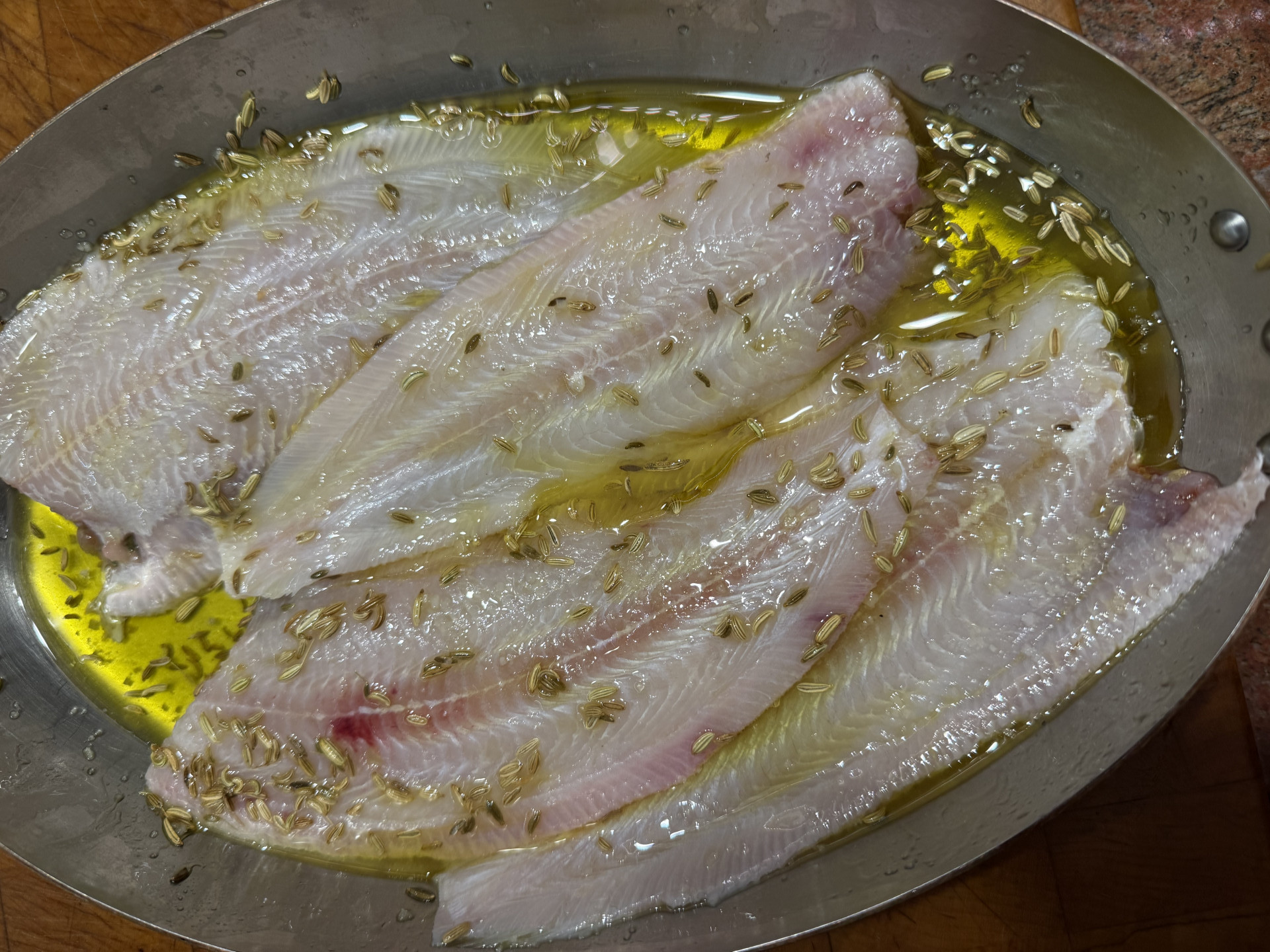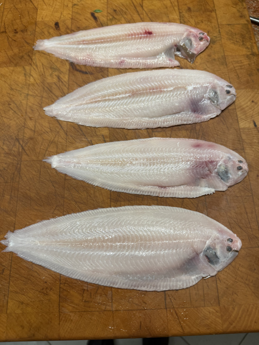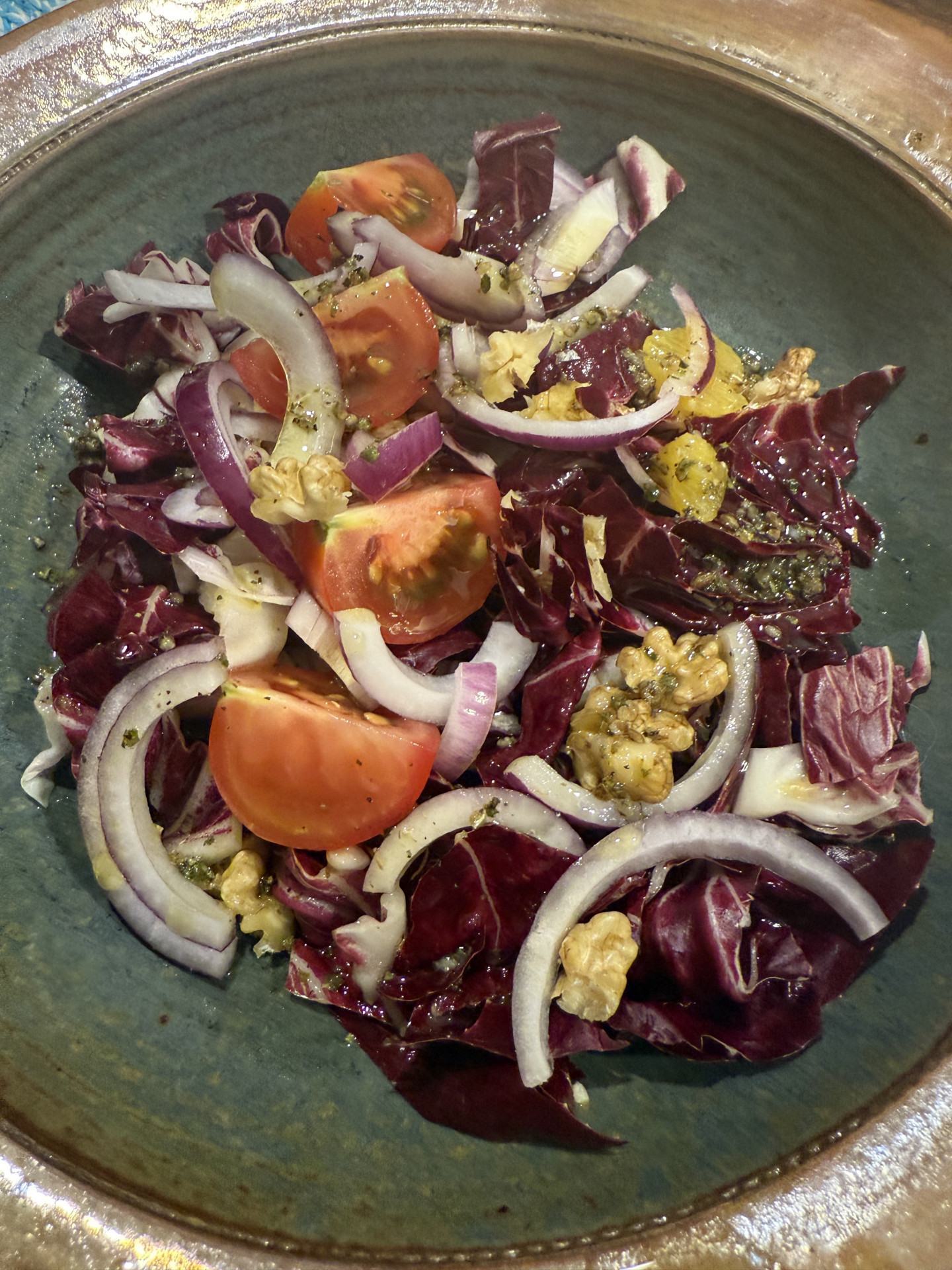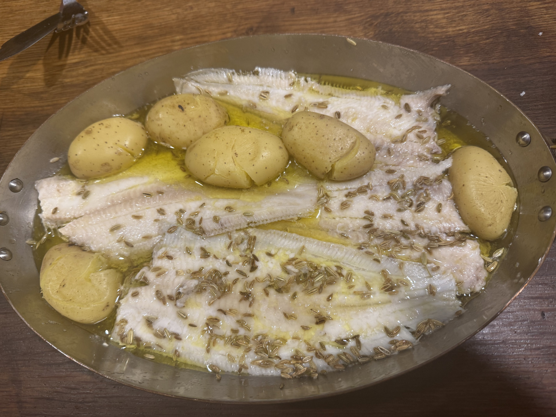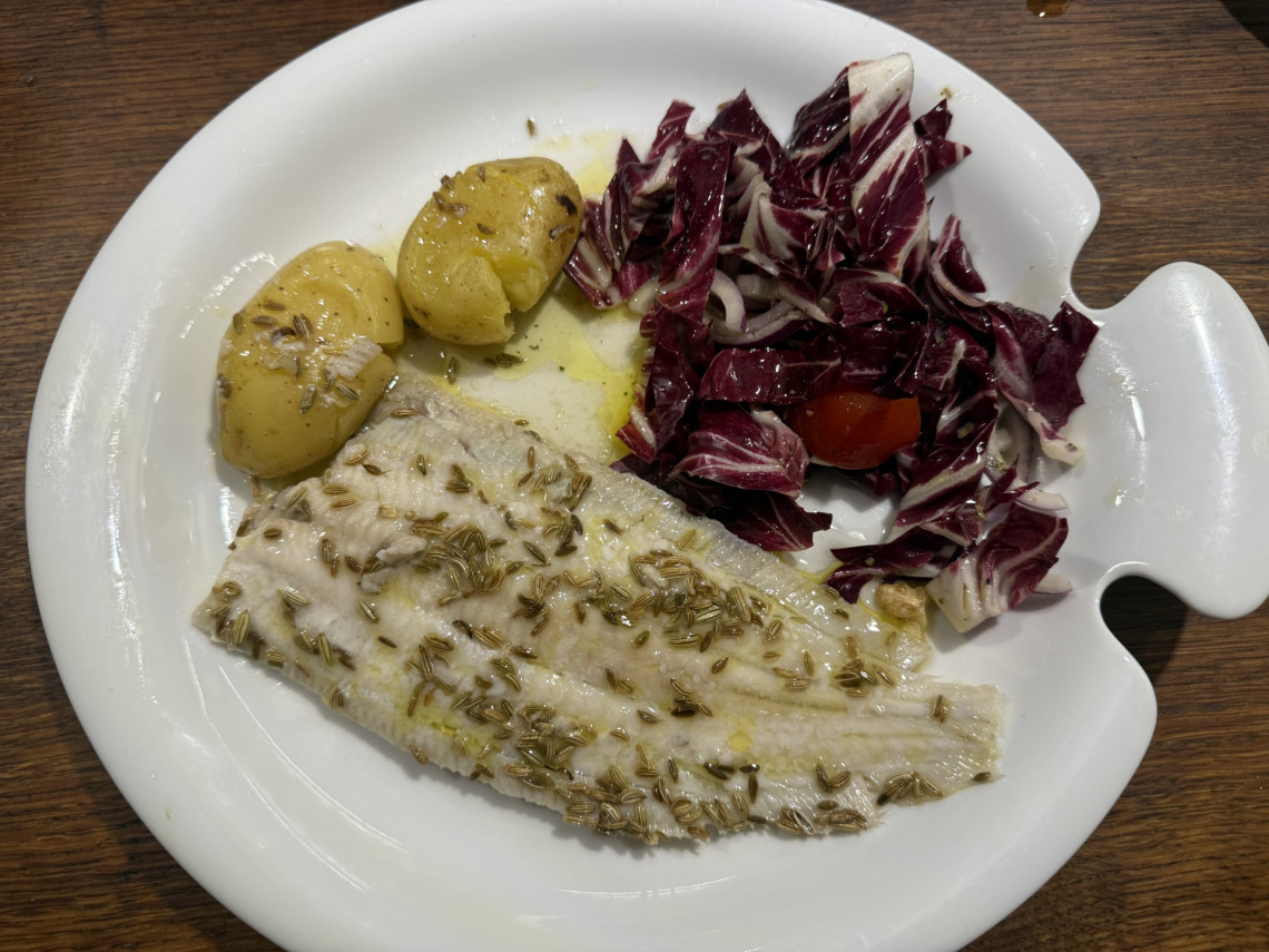 Baby Seezungen in Olivenöl mit Fenchelsaat gedünstet, Drillinge gedämpft, Chicorée mit Tomaten, Walnüssen und roten Zwiebeln in Olivenöl und Aceto balsamico.