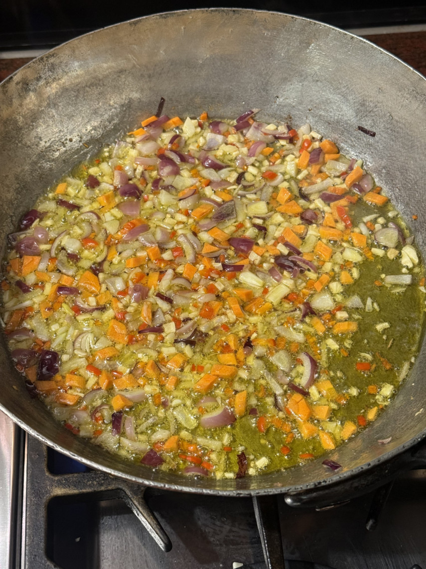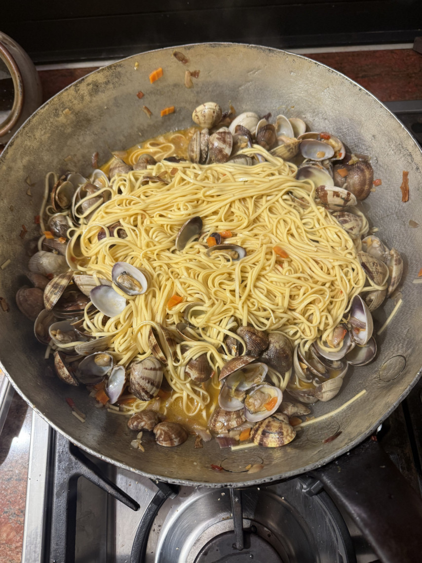 Zutaten für 3 Personen: 280 gr. Spaghetti, 1 kg Venusmuscheln, 70 ml Olivenöl, 2 klein geschnittene rote Zwiebeln, 5 große kleingehackte Knoblauchzehen, 1 TL süßes Paprikapulver, 1 klein geschnittene Peperoni, ein dünne Scheibe klein gewürfelter Knollensellerie, ein Stück klein gewürfelte Möhre, zisellierte Schale einer Zitrone, 1TL Macis (Muskatblüte), etwas Muskatnuss (vermutlich dem Originalrezept am nächsten, im wesentlichen sind es die gleichen Zutaten wie bei einem rheinischen Miesmuschelrezept).